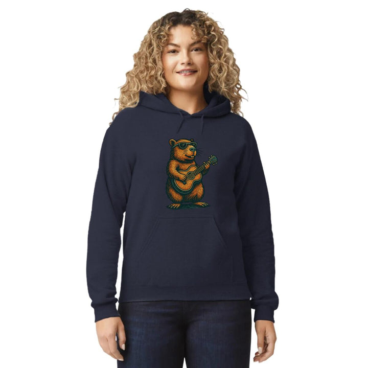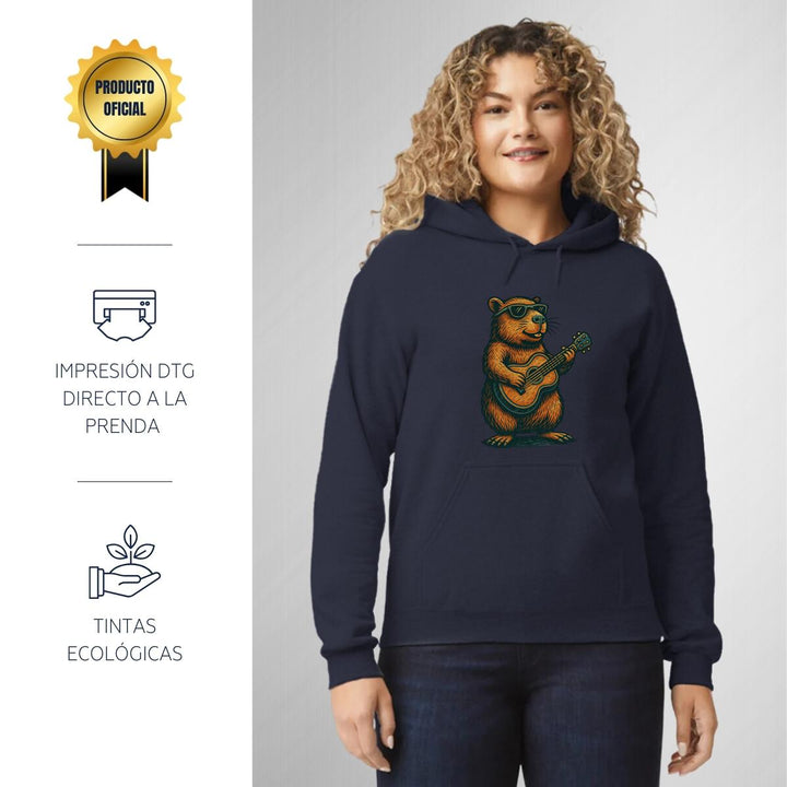 Sudadera hoodie de adulto con gorro o capucha y bolsillo frontal canguro, para mujer nueva, diseño Capibara Carpincho Frases original impreso con tecnología DTG (directo a la prenda) tacto cero, uso casual o deportiva, 50% algodón y 50% poliéster fleece pre encogido, estructura tubular con ajuste clásico. Colores de sudadera: Negro, Blanco, Azul Marino, Gris.