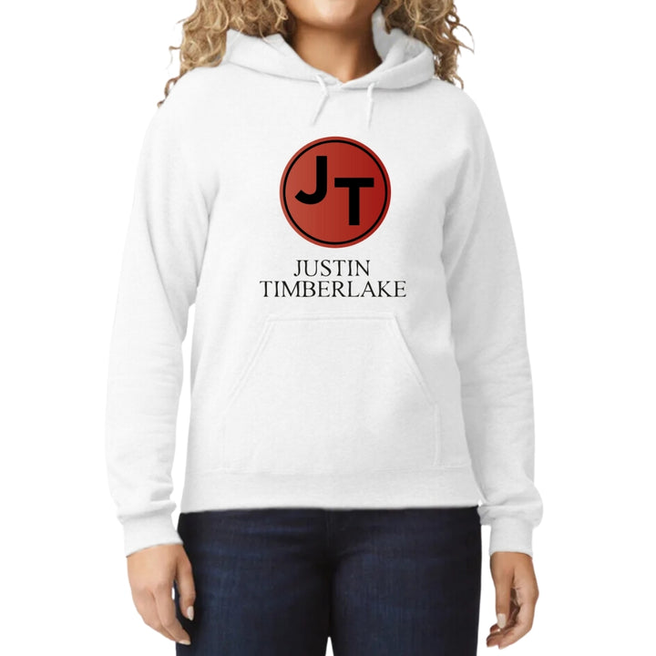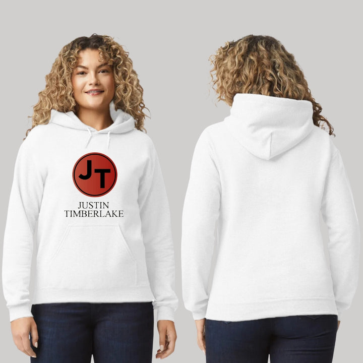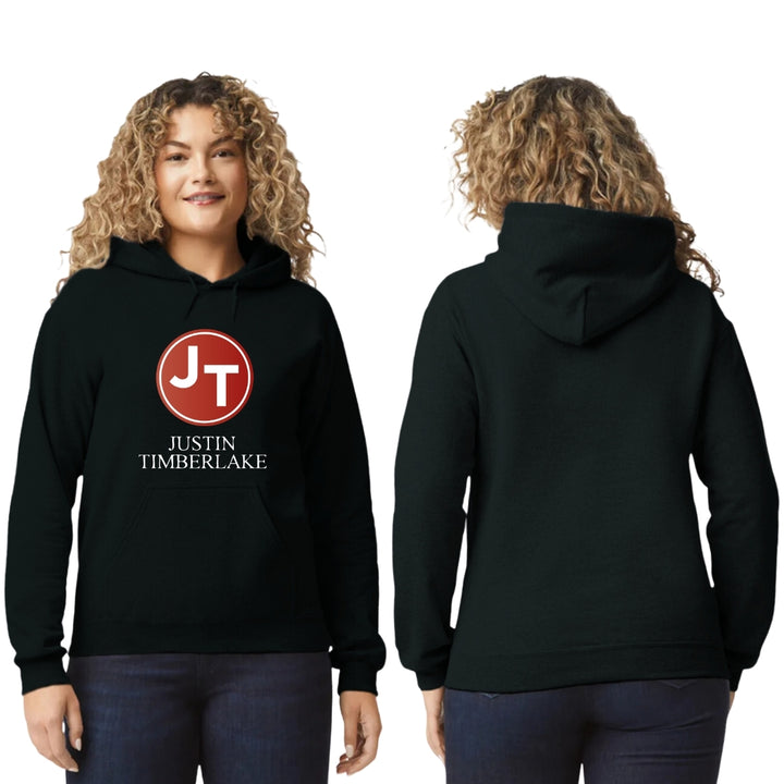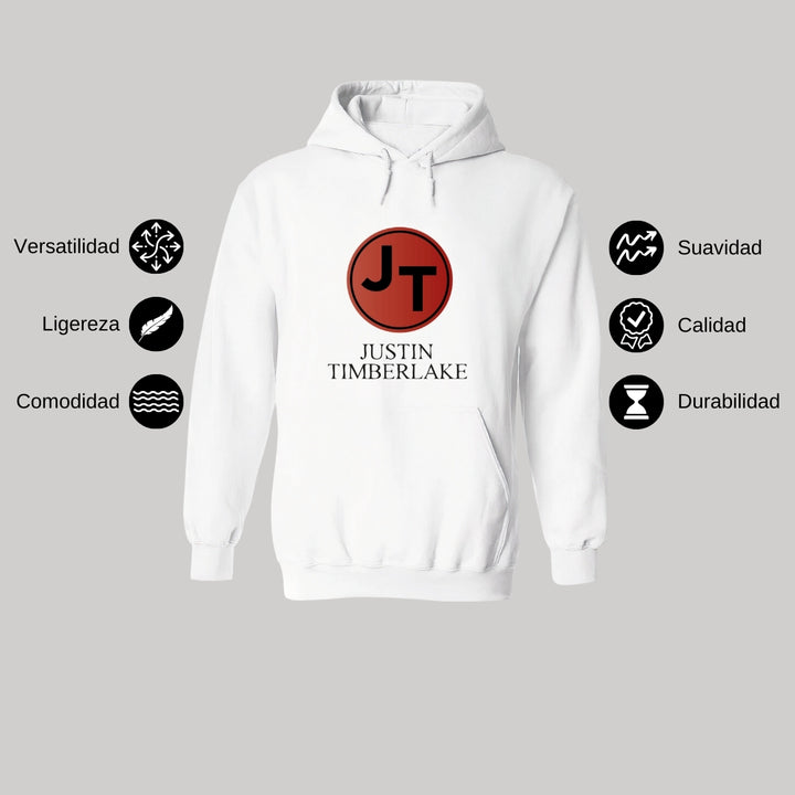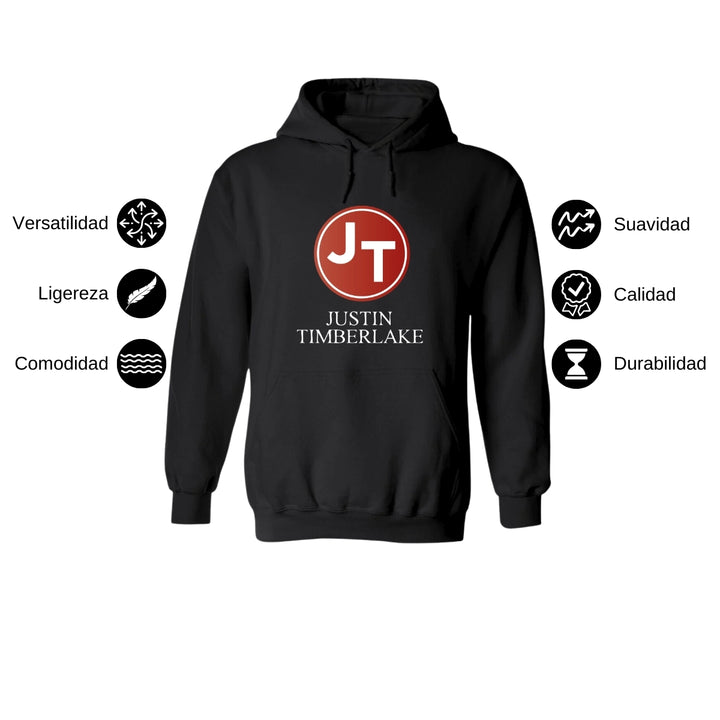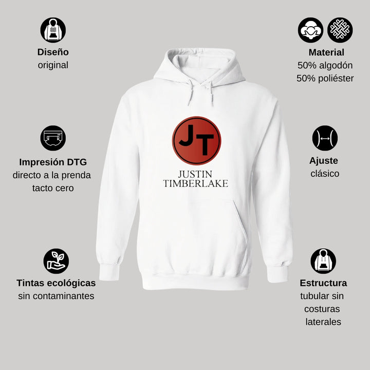 Sudadera hoodie de adulto con gorro o capucha y bolsillo frontal canguro, para mujer nueva, diseño Justin Timberlake Concierto original impreso con tecnología DTG (directo a la prenda) tacto cero, uso casual o deportiva, 50% algodón y 50% poliéster fleece pre encogido, estructura tubular con ajuste clásico. Colores de sudadera: Negro, Blanco.
