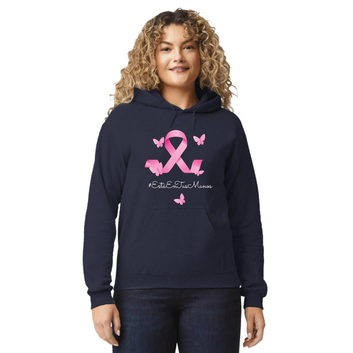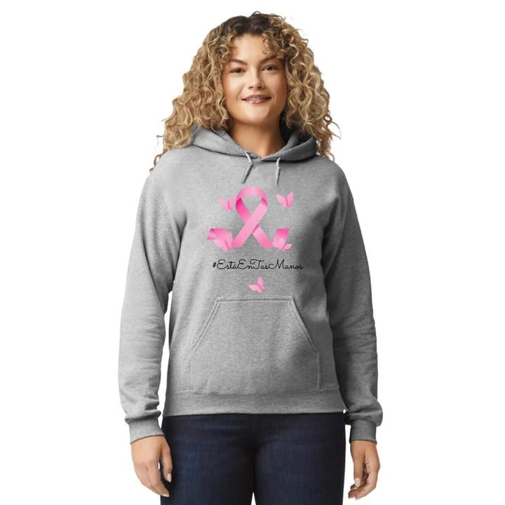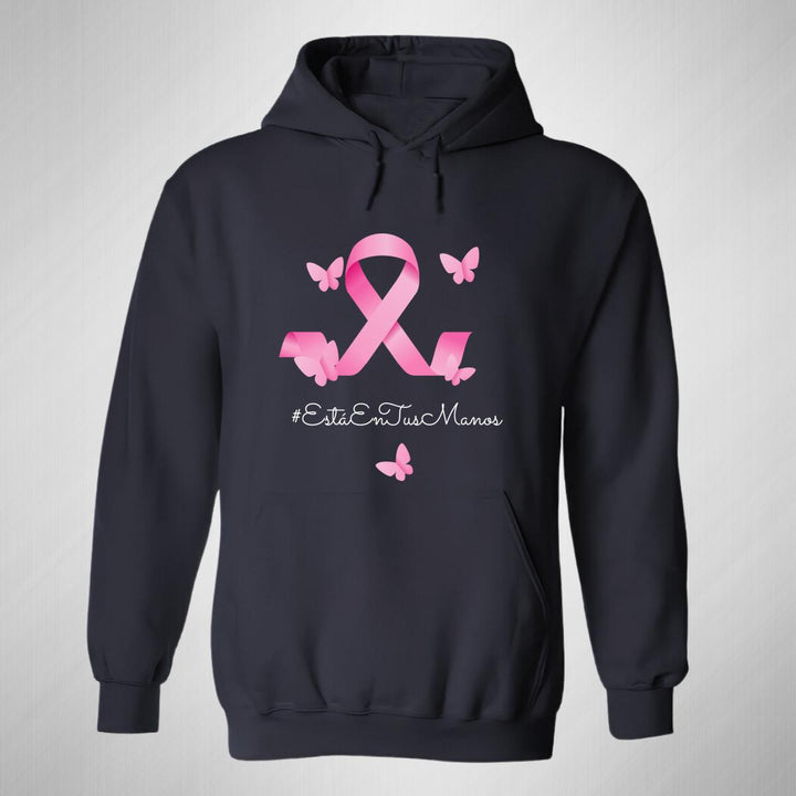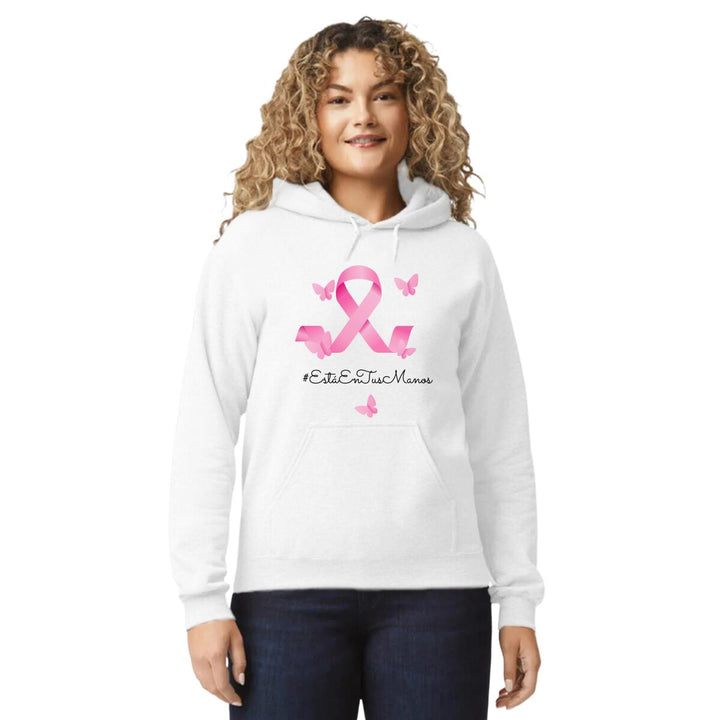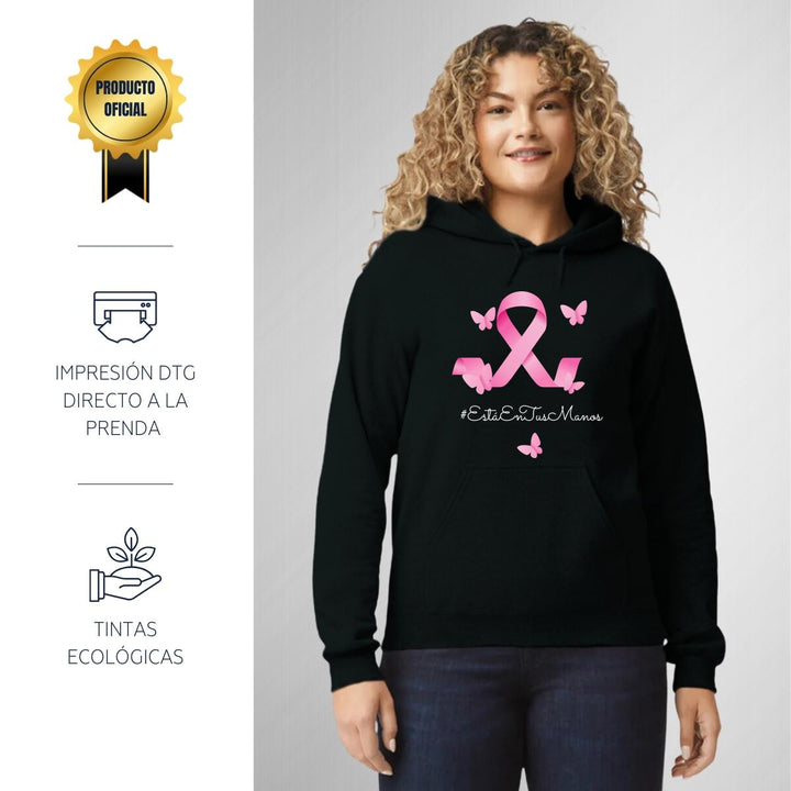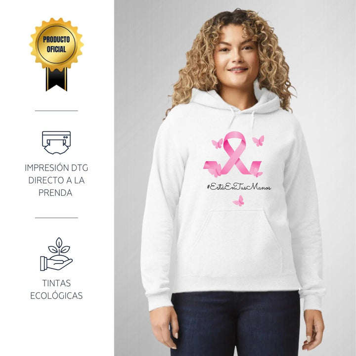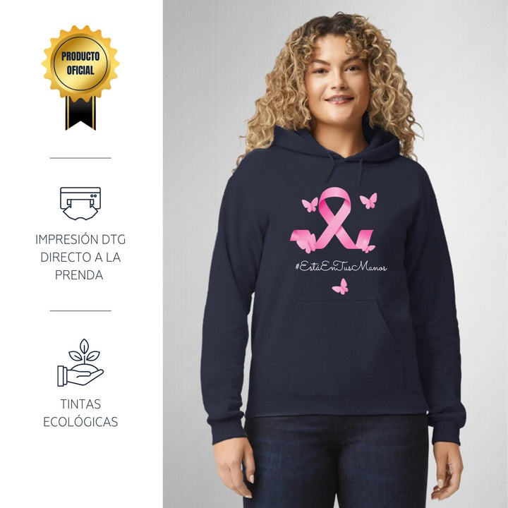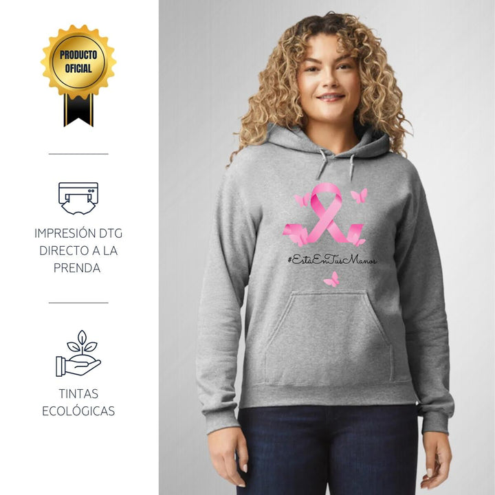 Sudadera hoodie de adulto con gorro o capucha y bolsillo frontal canguro, para mujer nueva, diseño Lucha Contra Cáncer Mama original impreso con tecnología DTG (directo a la prenda) tacto cero, uso casual o deportiva, 50% algodón y 50% poliéster fleece pre encogido, estructura tubular con ajuste clásico. Colores de sudadera: Negro, Blanco, Azul Marino, Gris.