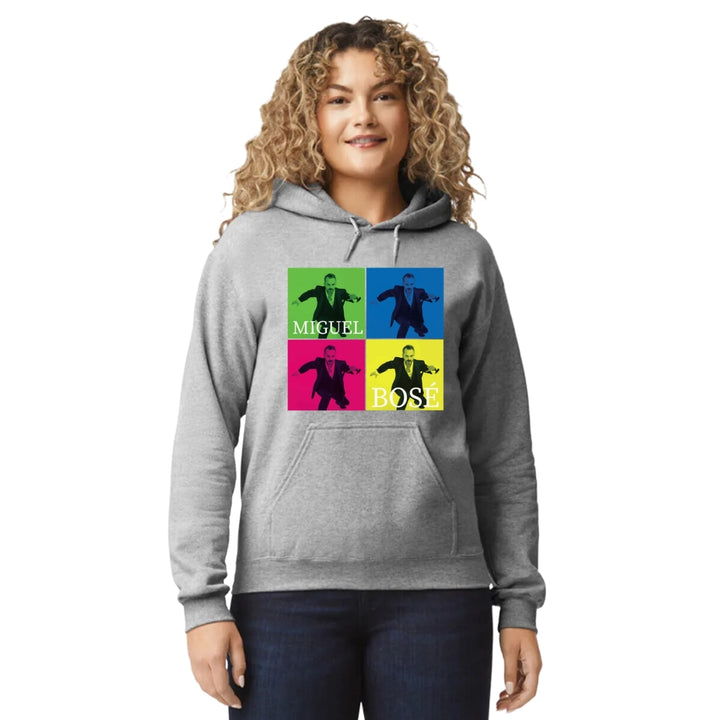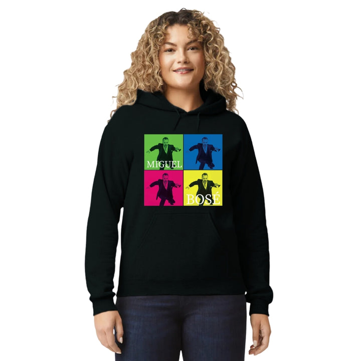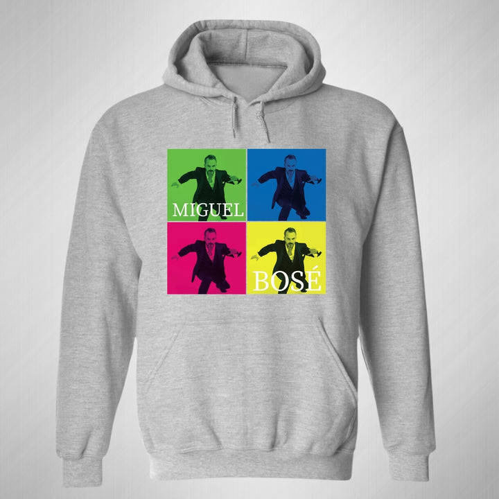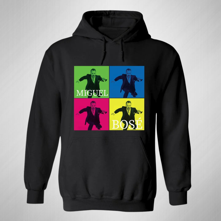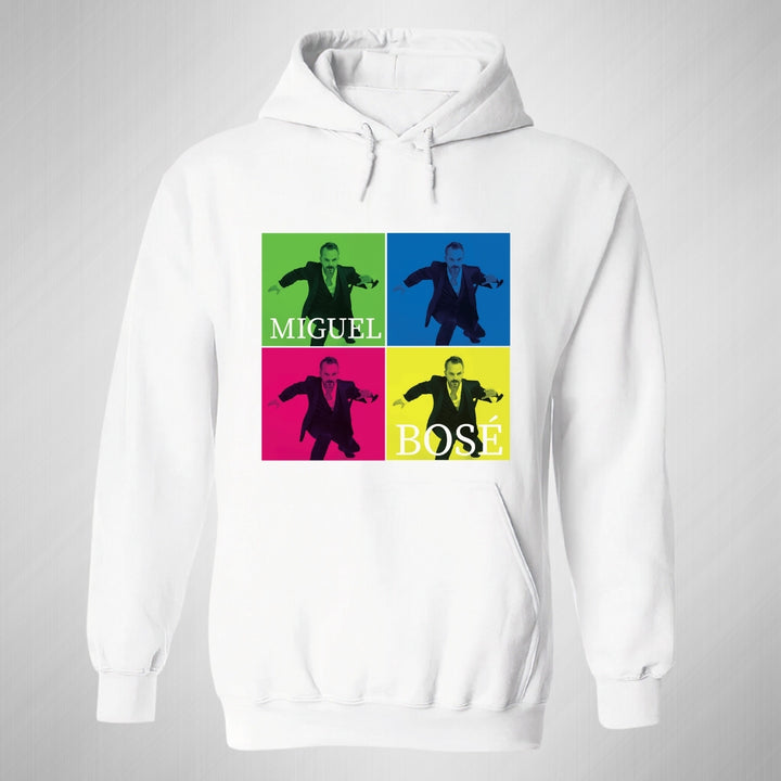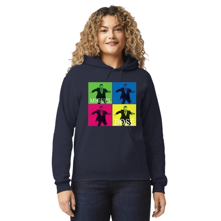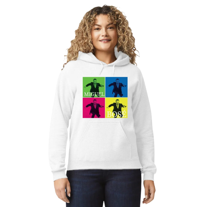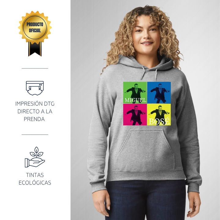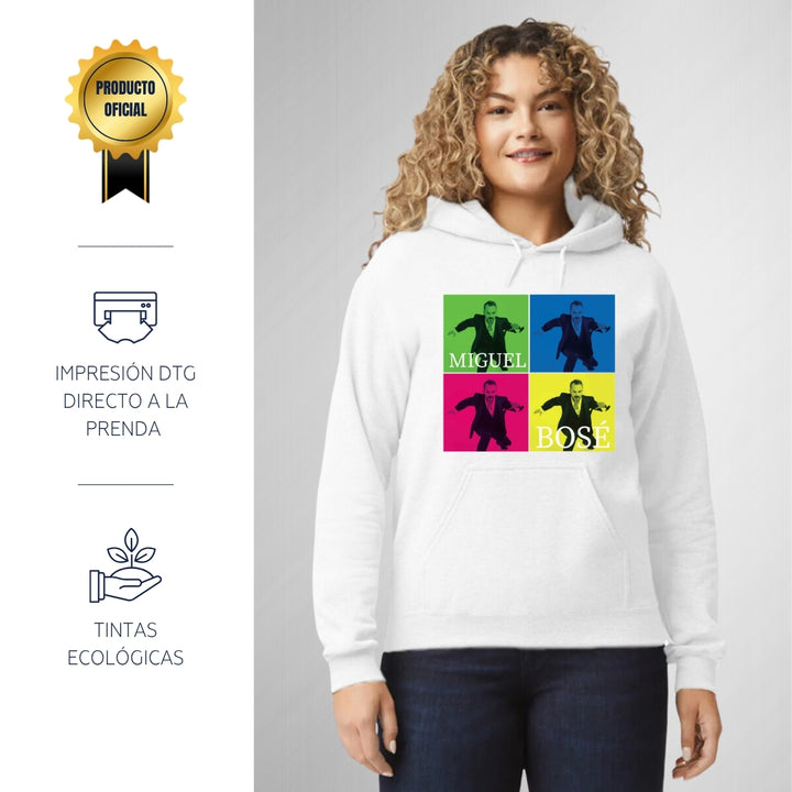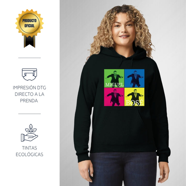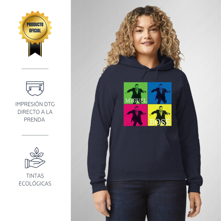 Sudadera hoodie de adulto con gorro o capucha y bolsillo frontal canguro, para mujer nueva, diseño Miguel Bosé Tour original impreso con tecnología DTG (directo a la prenda) tacto cero, uso casual o deportiva, 50% algodón y 50% poliéster fleece pre encogido, estructura tubular con ajuste clásico. Colores de sudadera: Negro, Blanco, Azul Marino, Gris.