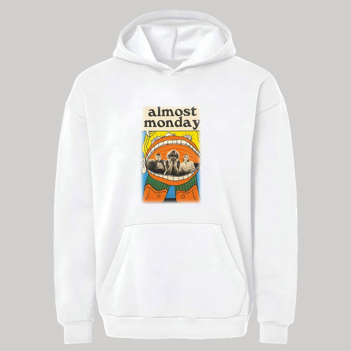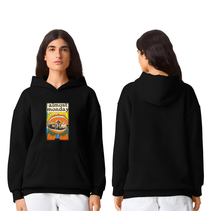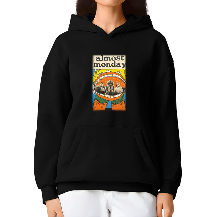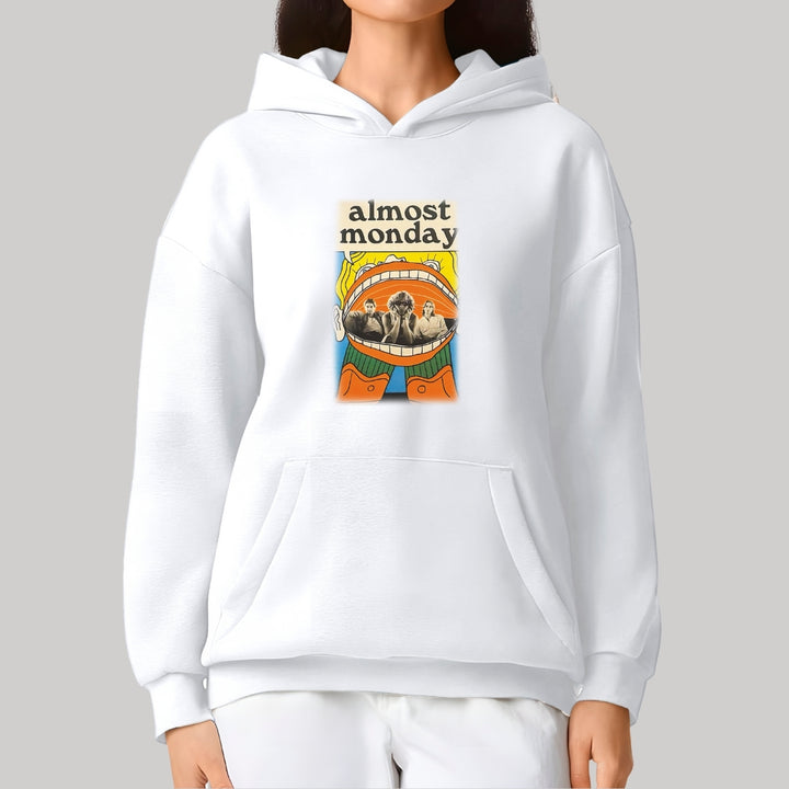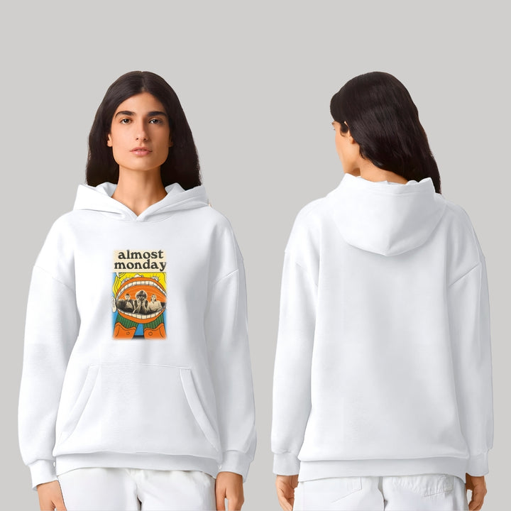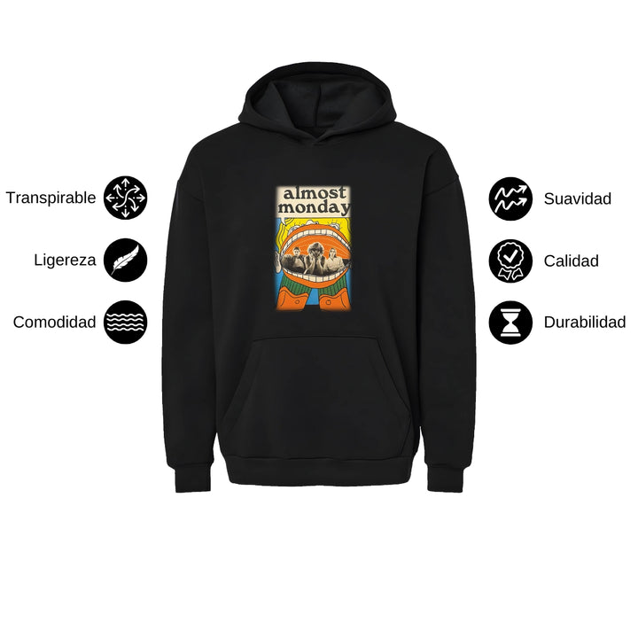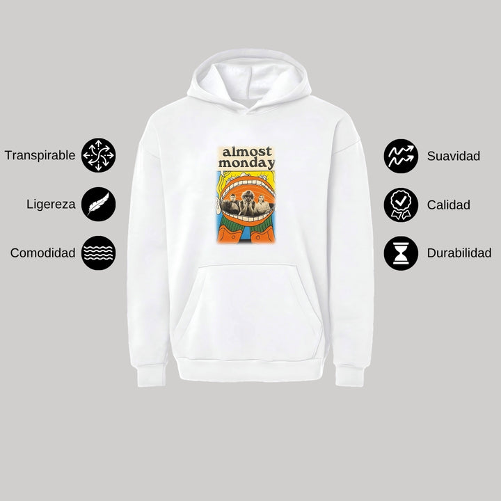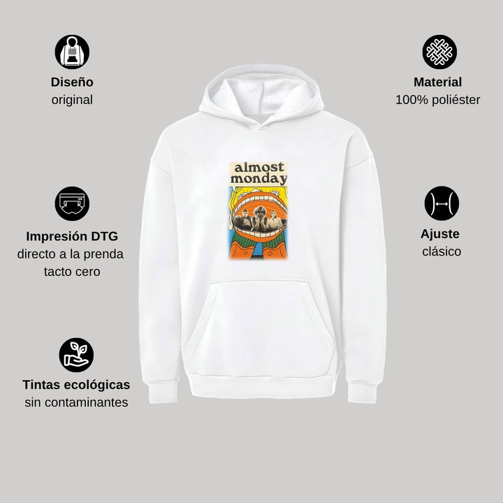 Sudadera hoodie transpirable pro dry de adulto con gorro o capucha y bolsillo frontal canguro, para mujer nueva, diseño Almost Monday impreso con tecnología DTG (directo a la prenda) tacto cero, uso casual o deportiva, 100% poliéster, ajuste clásico. Colores de sudadera: Negro, Blanco.