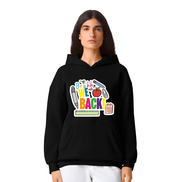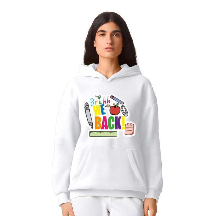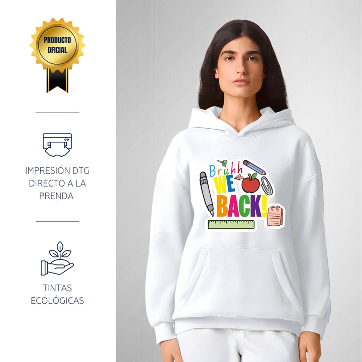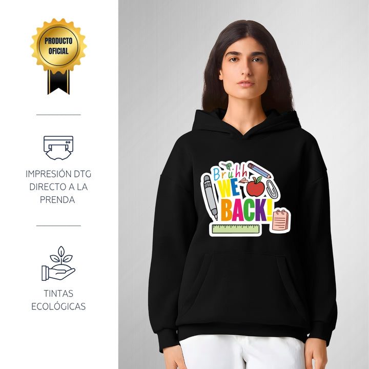 Sudadera hoodie transpirable pro dry de adulto con gorro o capucha y bolsillo frontal canguro, para mujer nueva, diseño Back to school impreso con tecnología DTG (directo a la prenda) tacto cero, uso casual o deportiva, 100% poliéster, ajuste clásico. Colores de sudadera: Negro, Blanco.