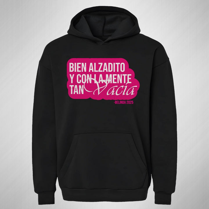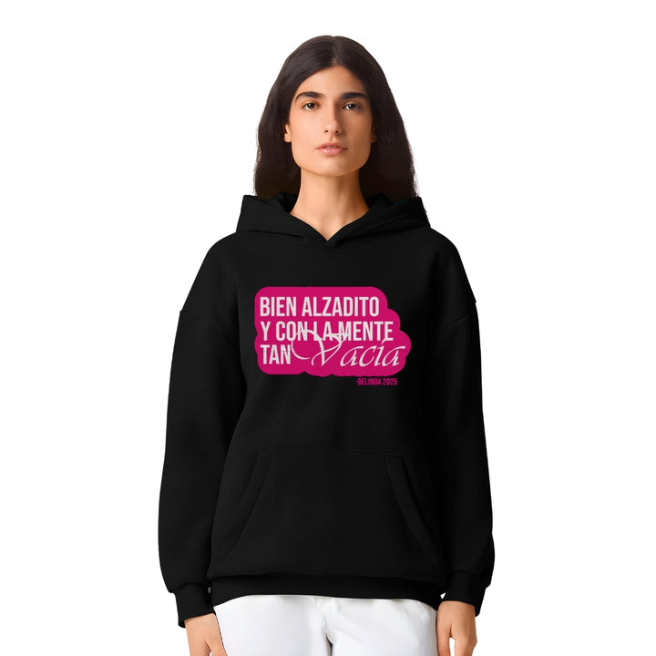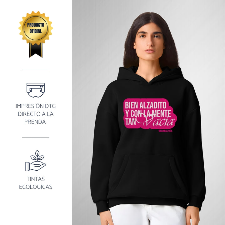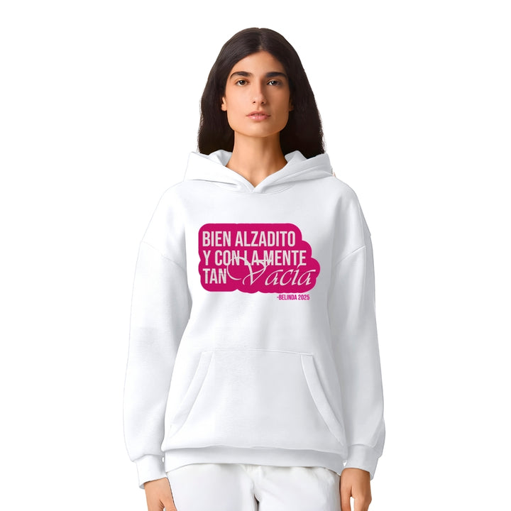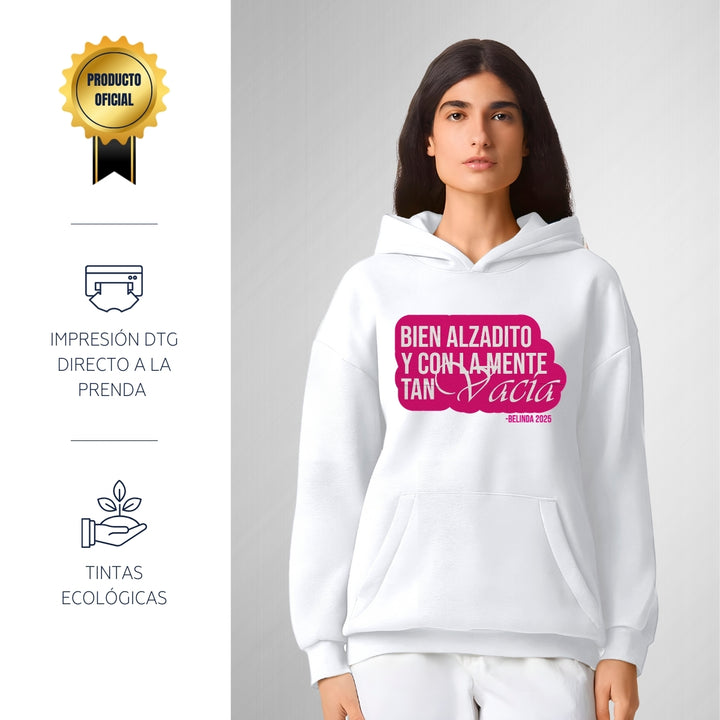 Sudadera hoodie transpirable pro dry de adulto con gorro o capucha y bolsillo frontal canguro, para mujer nueva, diseño Belinda Bien Alzadito impreso con tecnología DTG (directo a la prenda) tacto cero, uso casual o deportiva, 100% poliéster, ajuste clásico. Colores de sudadera: Negro, Blanco.