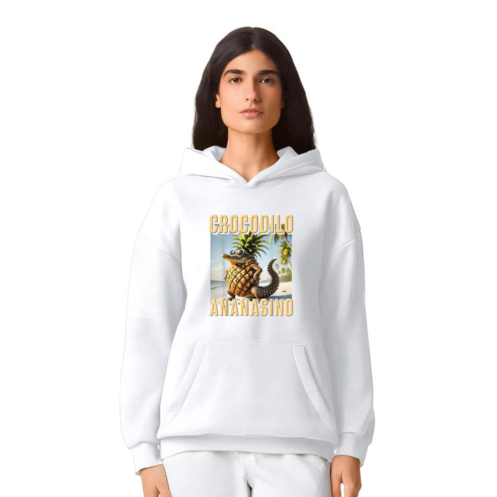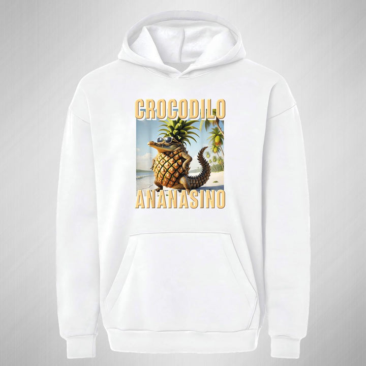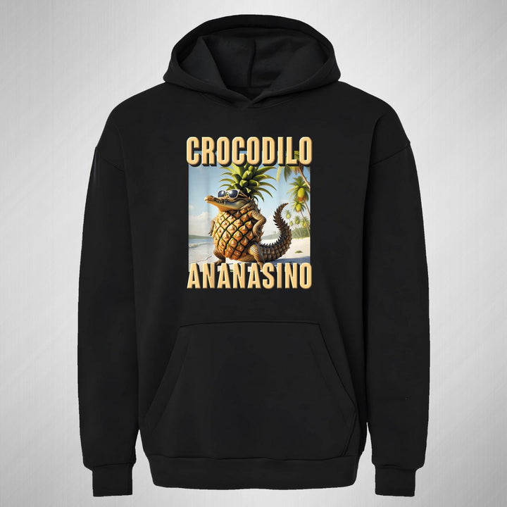 Sudadera hoodie transpirable pro dry de adulto con gorro o capucha y bolsillo frontal canguro, para mujer nueva, diseño Brainrot Crocodilo Ananasino impreso con tecnología DTG (directo a la prenda) tacto cero, uso casual o deportiva, 100% poliéster, ajuste clásico. Colores de sudadera: Negro, Blanco.