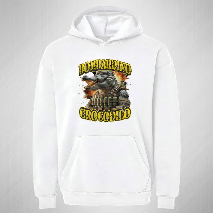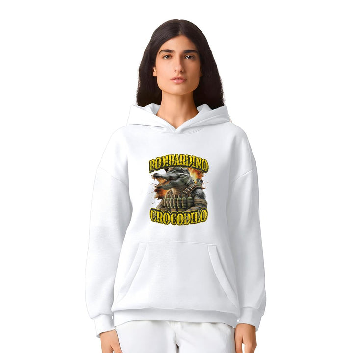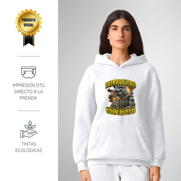 Sudadera hoodie transpirable pro dry de adulto con gorro o capucha y bolsillo frontal canguro, para mujer nueva, diseño Brainrot Bombardino Cocodrilo impreso con tecnología DTG (directo a la prenda) tacto cero, uso casual o deportiva, 100% poliéster, ajuste clásico. Colores de sudadera: Negro, Blanco.