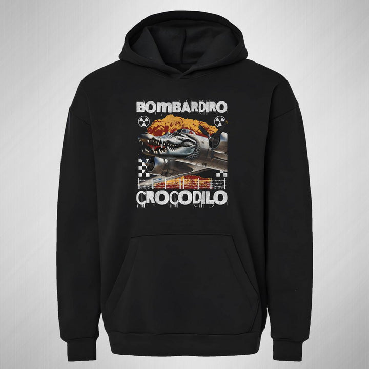 Sudadera hoodie transpirable pro dry de adulto con gorro o capucha y bolsillo frontal canguro, para mujer nueva, diseño Brainrot Bombardiro Crocodilo impreso con tecnología DTG (directo a la prenda) tacto cero, uso casual o deportiva, 100% poliéster, ajuste clásico. Colores de sudadera: Negro.