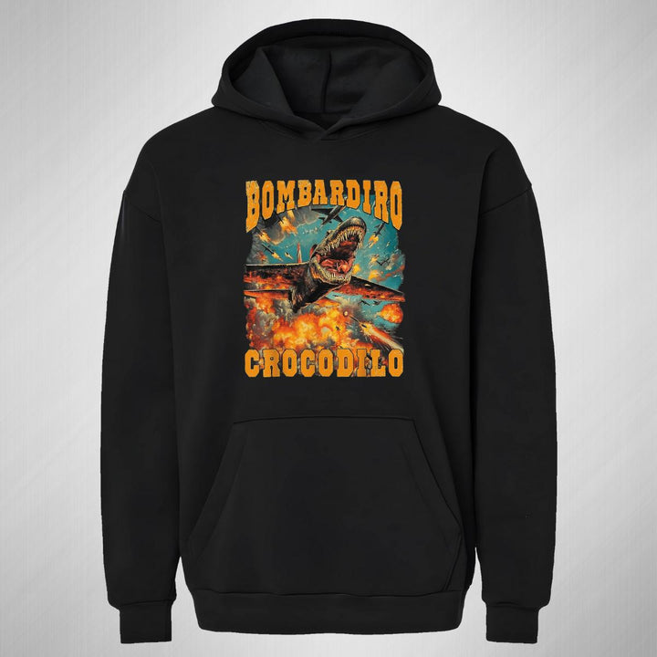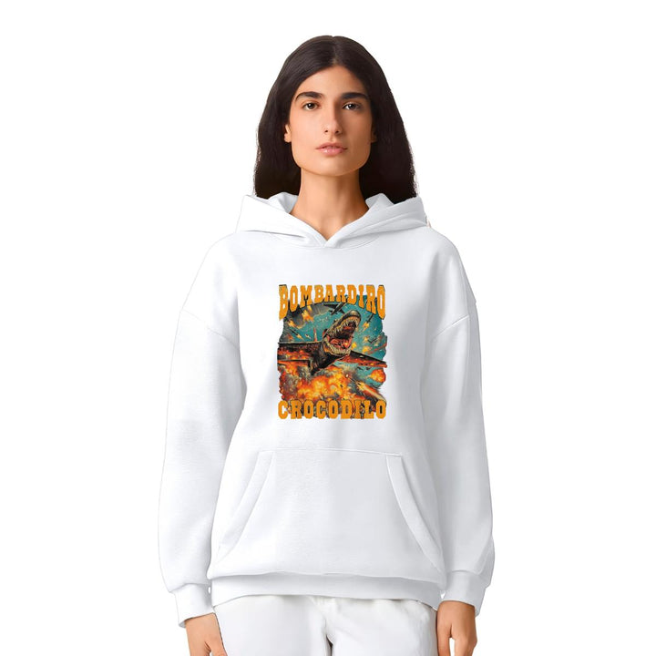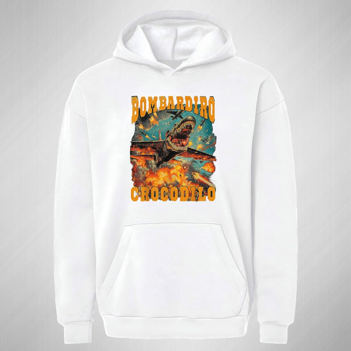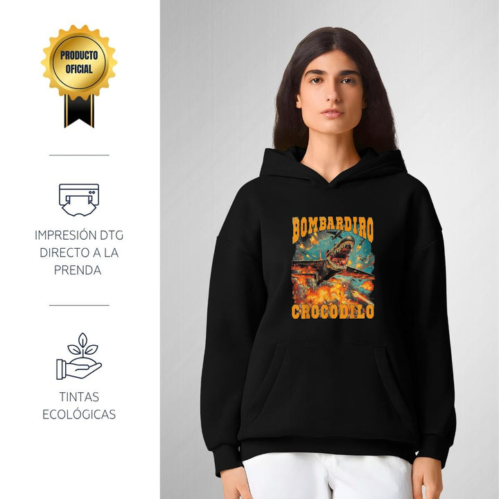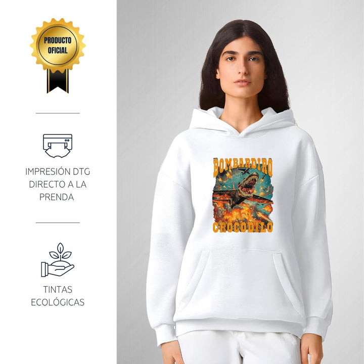 Sudadera hoodie transpirable pro dry de adulto con gorro o capucha y bolsillo frontal canguro, para mujer nueva, diseño Brainrot Bombardiro Crocodilo impreso con tecnología DTG (directo a la prenda) tacto cero, uso casual o deportiva, 100% poliéster, ajuste clásico. Colores de sudadera: Negro, Blanco.