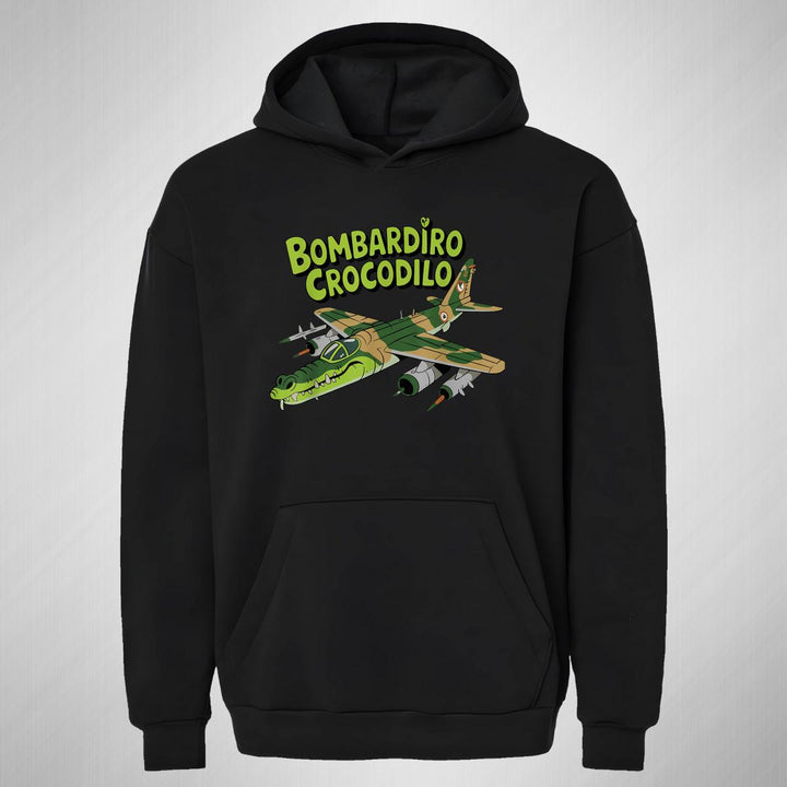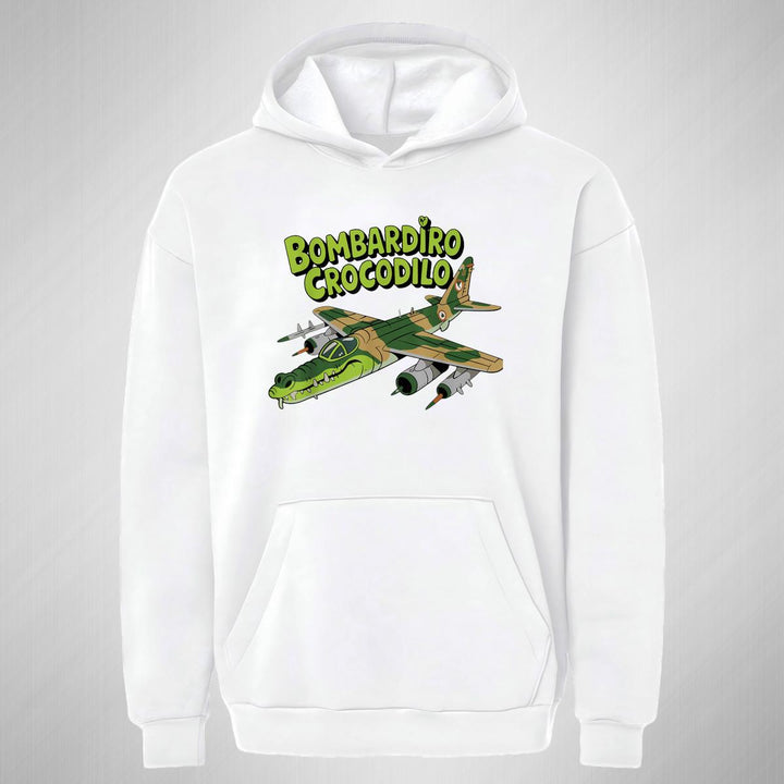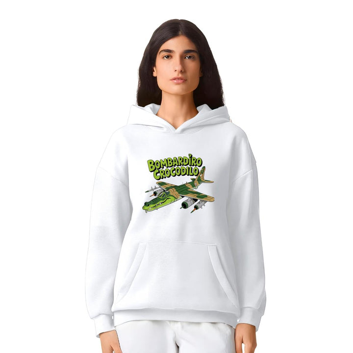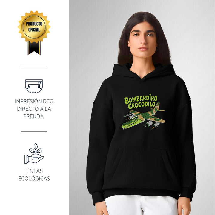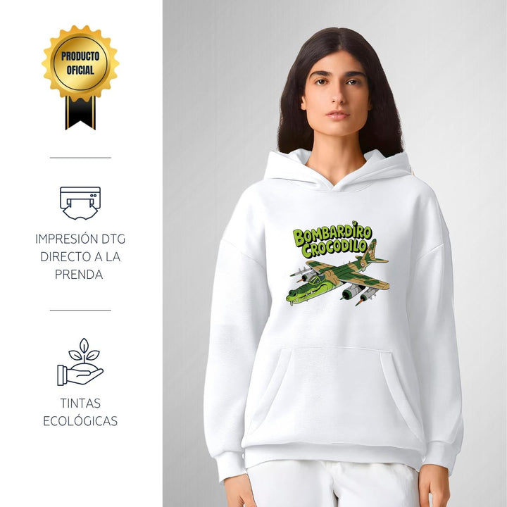 Sudadera hoodie transpirable pro dry de adulto con gorro o capucha y bolsillo frontal canguro, para mujer nueva, diseño Brainrot Bombardiro Crocodilo impreso con tecnología DTG (directo a la prenda) tacto cero, uso casual o deportiva, 100% poliéster, ajuste clásico. Colores de sudadera: Negro, Blanco.