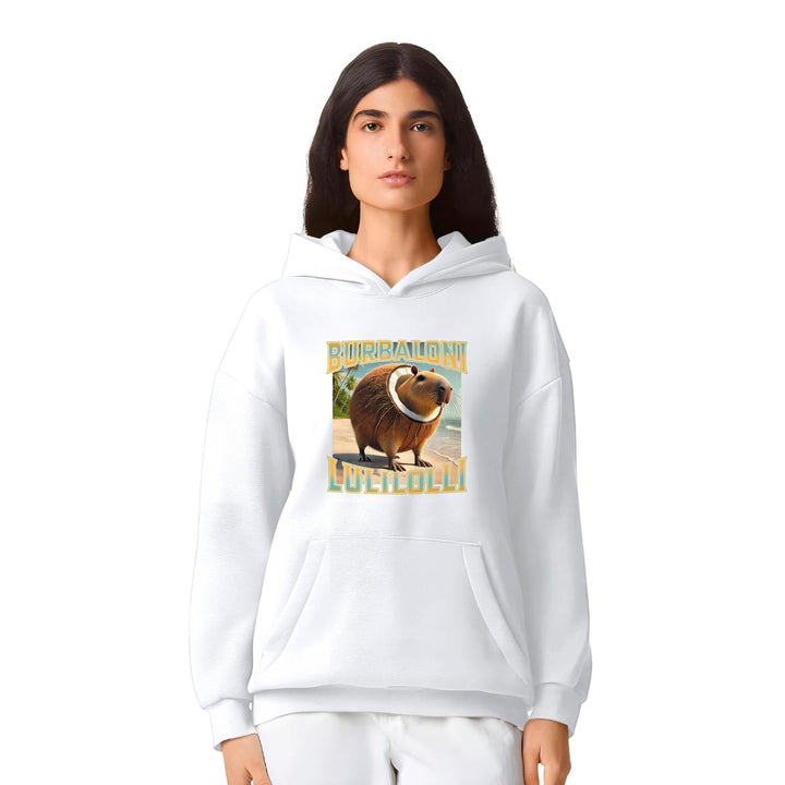 Sudadera hoodie transpirable pro dry de adulto con gorro o capucha y bolsillo frontal canguro, para mujer nueva, diseño Brainrot Burbaloni Luliloli impreso con tecnología DTG (directo a la prenda) tacto cero, uso casual o deportiva, 100% poliéster, ajuste clásico. Colores de sudadera: Negro, Blanco.