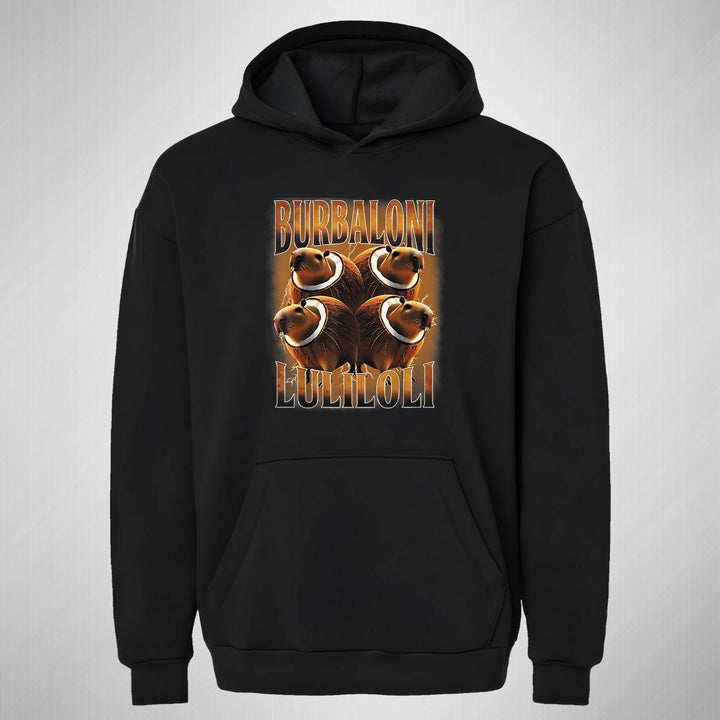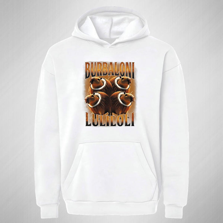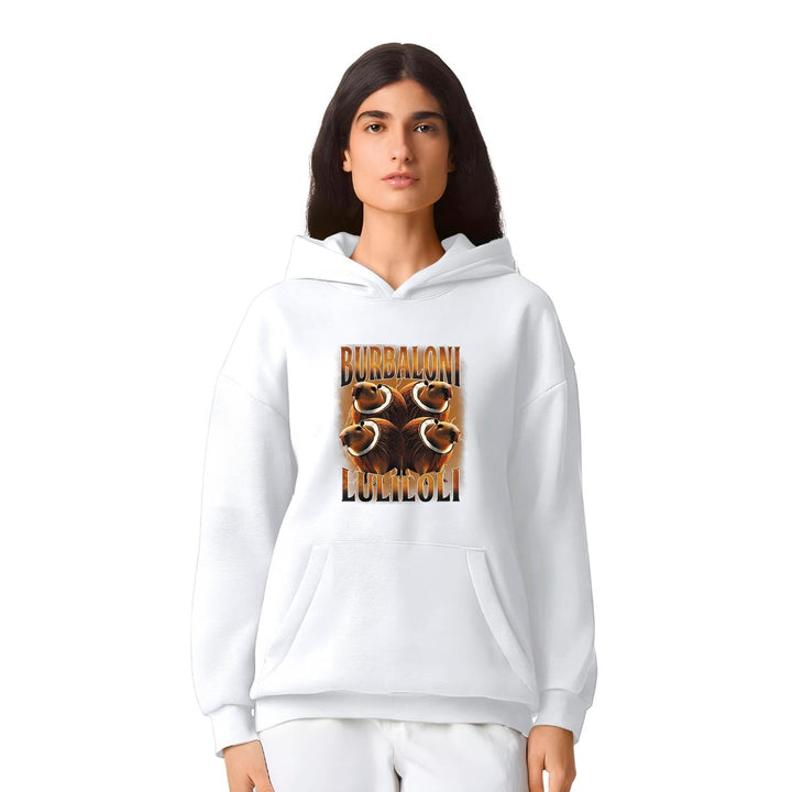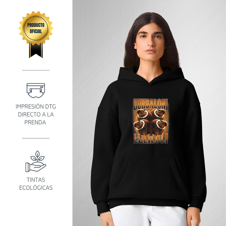 Sudadera hoodie transpirable pro dry de adulto con gorro o capucha y bolsillo frontal canguro, para mujer nueva, diseño Brainrot Burbaloni Luliloli impreso con tecnología DTG (directo a la prenda) tacto cero, uso casual o deportiva, 100% poliéster, ajuste clásico. Colores de sudadera: Negro, Blanco.