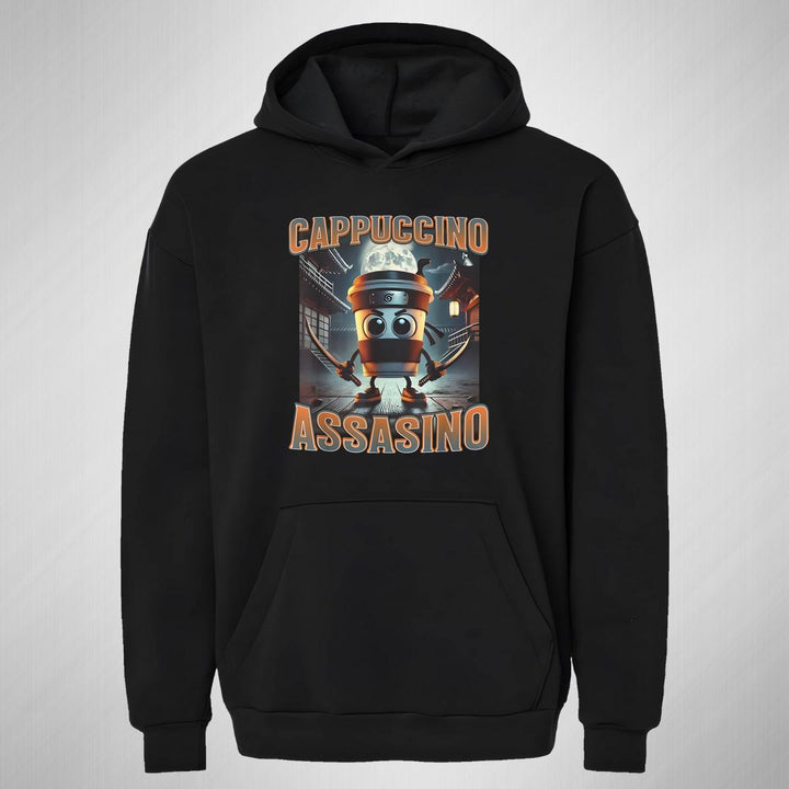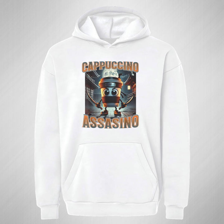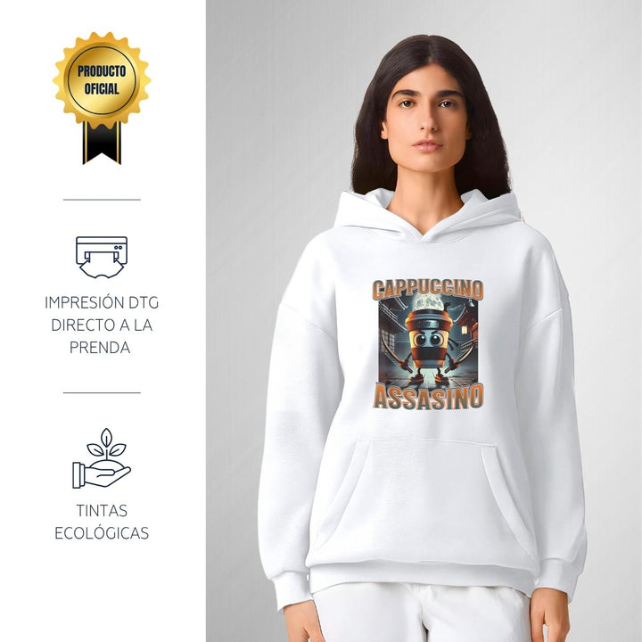 Sudadera hoodie transpirable pro dry de adulto con gorro o capucha y bolsillo frontal canguro, para mujer nueva, diseño Brainrot Cappuccino Assassino impreso con tecnología DTG (directo a la prenda) tacto cero, uso casual o deportiva, 100% poliéster, ajuste clásico. Colores de sudadera: Negro, Blanco.