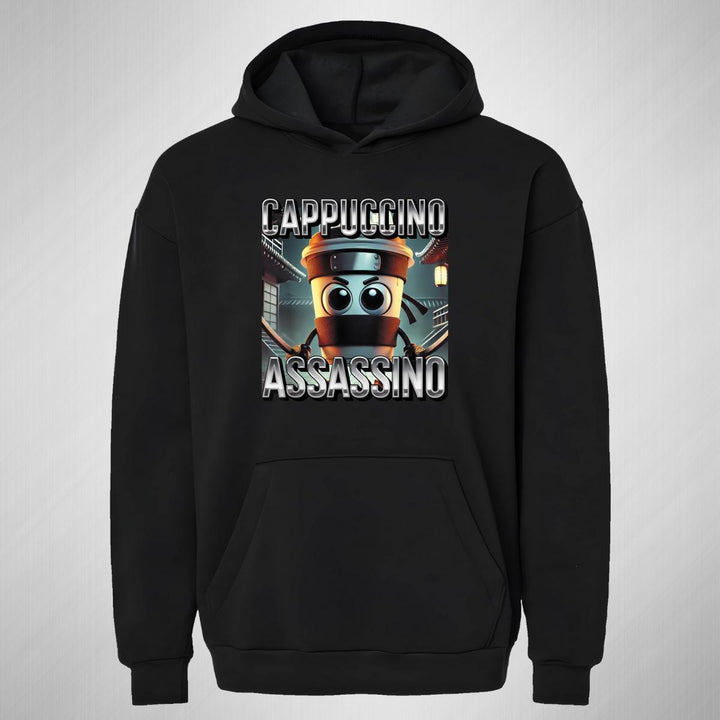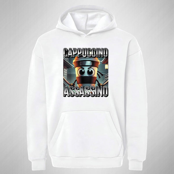 Sudadera hoodie transpirable pro dry de adulto con gorro o capucha y bolsillo frontal canguro, para mujer nueva, diseño Brainrot Cappuccino Assassino impreso con tecnología DTG (directo a la prenda) tacto cero, uso casual o deportiva, 100% poliéster, ajuste clásico. Colores de sudadera: Negro, Blanco.