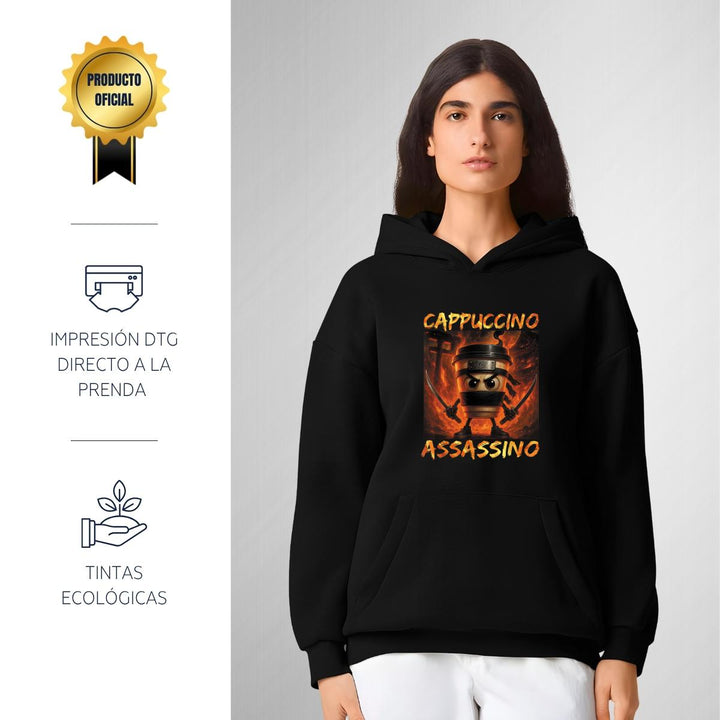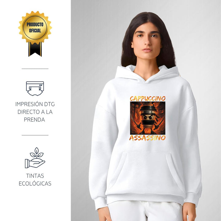 Sudadera hoodie transpirable pro dry de adulto con gorro o capucha y bolsillo frontal canguro, para mujer nueva, diseño Brainrot Cappuccino Assassino impreso con tecnología DTG (directo a la prenda) tacto cero, uso casual o deportiva, 100% poliéster, ajuste clásico. Colores de sudadera: Negro, Blanco.