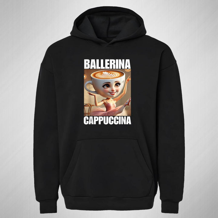 Sudadera hoodie transpirable pro dry de adulto con gorro o capucha y bolsillo frontal canguro, para mujer nueva, diseño Brainrot Ballerina Capuchina impreso con tecnología DTG (directo a la prenda) tacto cero, uso casual o deportiva, 100% poliéster, ajuste clásico. Colores de sudadera: Negro.