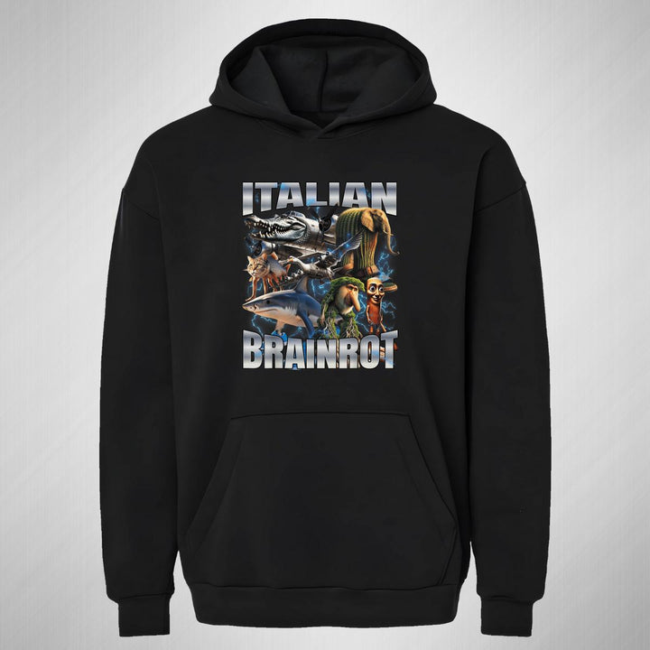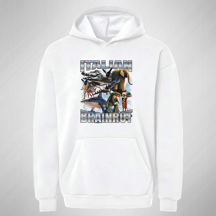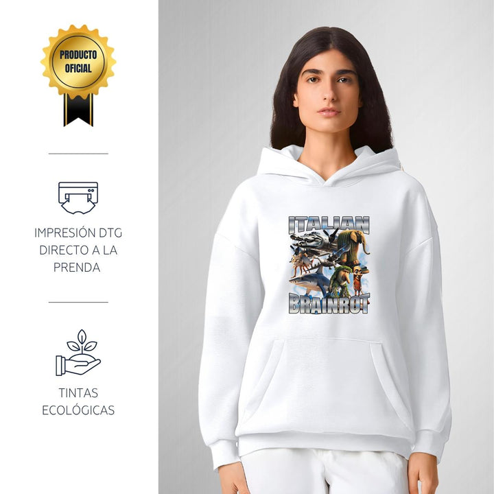 Sudadera hoodie transpirable pro dry de adulto con gorro o capucha y bolsillo frontal canguro, para mujer nueva, diseño Brainrot Italianos impreso con tecnología DTG (directo a la prenda) tacto cero, uso casual o deportiva, 100% poliéster, ajuste clásico. Colores de sudadera: Negro, Blanco.
