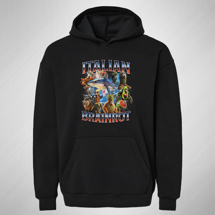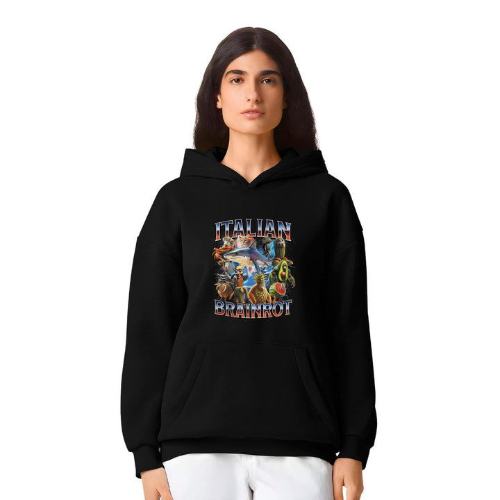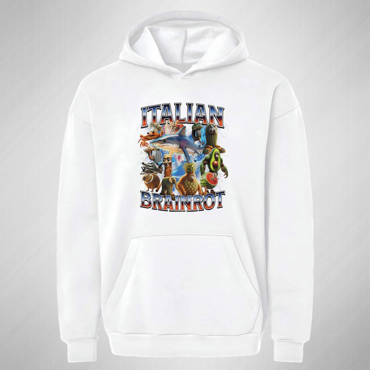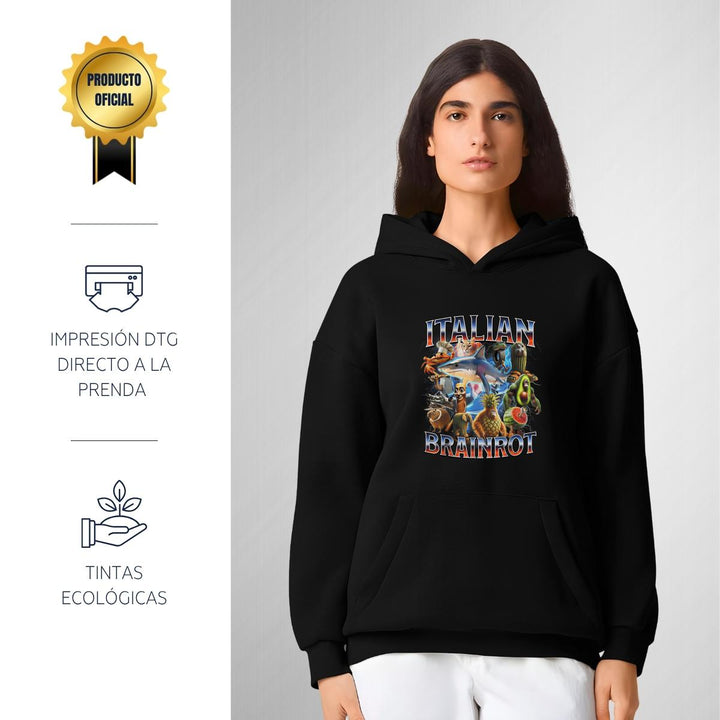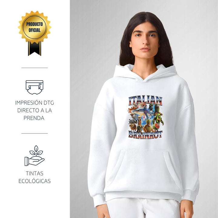 Sudadera hoodie transpirable pro dry de adulto con gorro o capucha y bolsillo frontal canguro, para mujer nueva, diseño Brainrot Italianos impreso con tecnología DTG (directo a la prenda) tacto cero, uso casual o deportiva, 100% poliéster, ajuste clásico. Colores de sudadera: Negro, Blanco.
