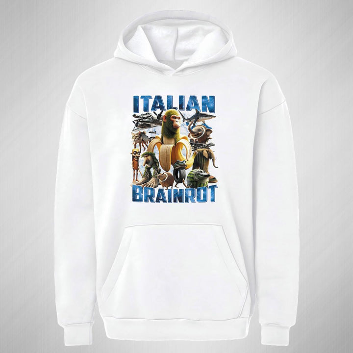 Sudadera hoodie transpirable pro dry de adulto con gorro o capucha y bolsillo frontal canguro, para mujer nueva, diseño Brainrot Italianos impreso con tecnología DTG (directo a la prenda) tacto cero, uso casual o deportiva, 100% poliéster, ajuste clásico. Colores de sudadera: Negro, Blanco.
