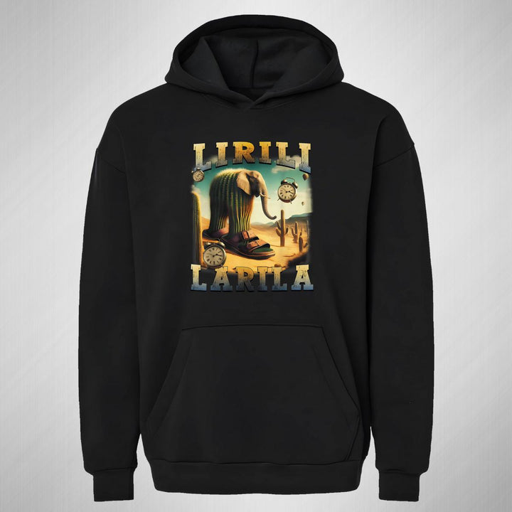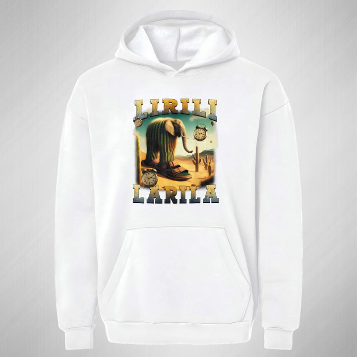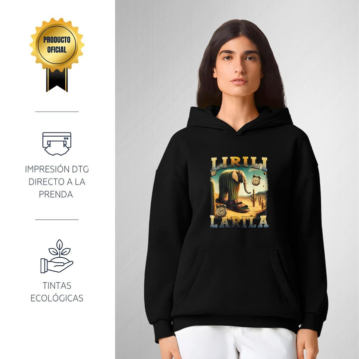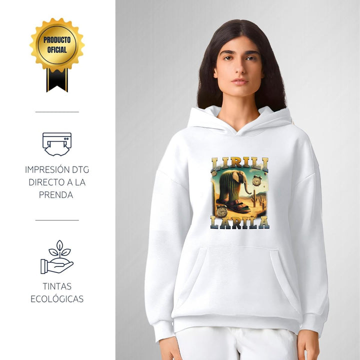 Sudadera hoodie transpirable pro dry de adulto con gorro o capucha y bolsillo frontal canguro, para mujer nueva, diseño Brainrot Lirili Larila impreso con tecnología DTG (directo a la prenda) tacto cero, uso casual o deportiva, 100% poliéster, ajuste clásico. Colores de sudadera: Negro, Blanco.