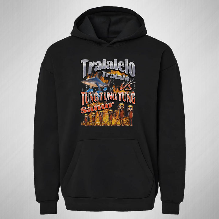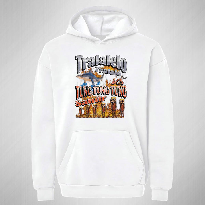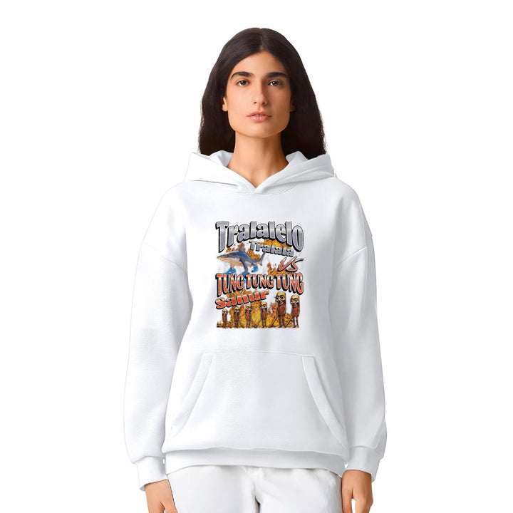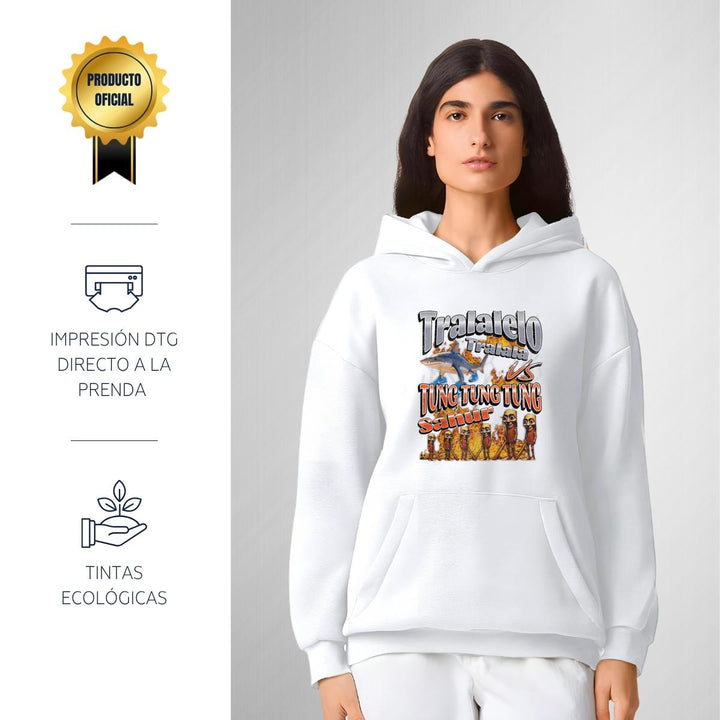 Sudadera hoodie transpirable pro dry de adulto con gorro o capucha y bolsillo frontal canguro, para mujer nueva, diseño Brainrot Tralala Tung Tung impreso con tecnología DTG (directo a la prenda) tacto cero, uso casual o deportiva, 100% poliéster, ajuste clásico. Colores de sudadera: Negro, Blanco.