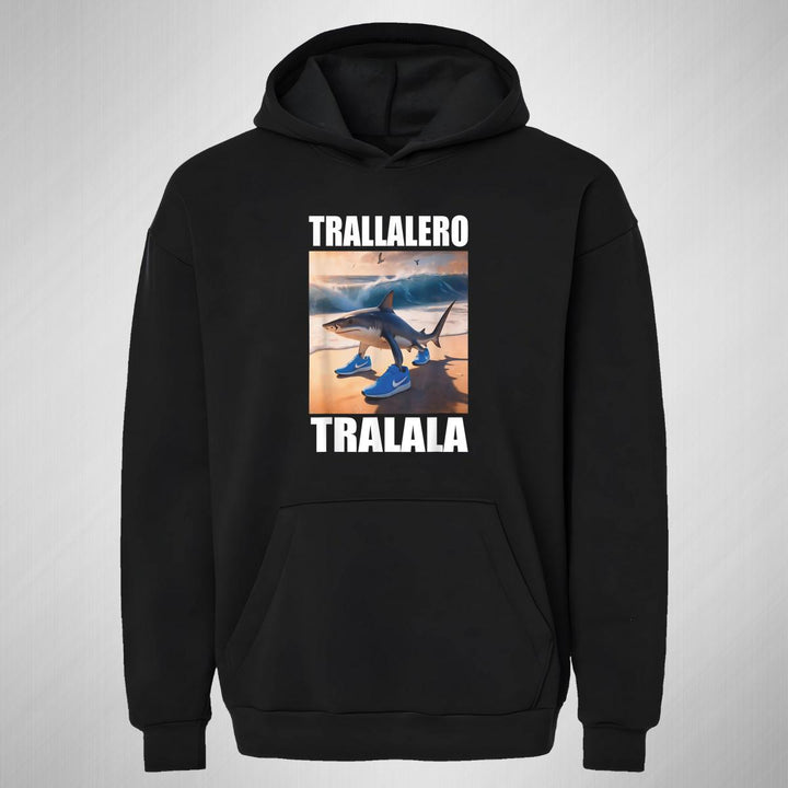 Sudadera hoodie transpirable pro dry de adulto con gorro o capucha y bolsillo frontal canguro, para mujer nueva, diseño Brainrot Tralalero Tralala impreso con tecnología DTG (directo a la prenda) tacto cero, uso casual o deportiva, 100% poliéster, ajuste clásico. Colores de sudadera: Negro.
