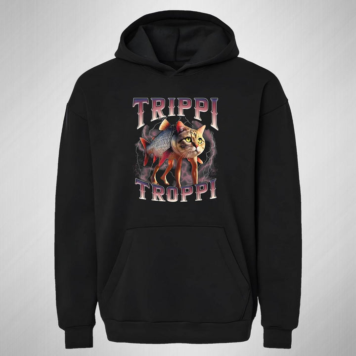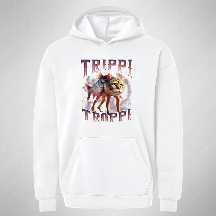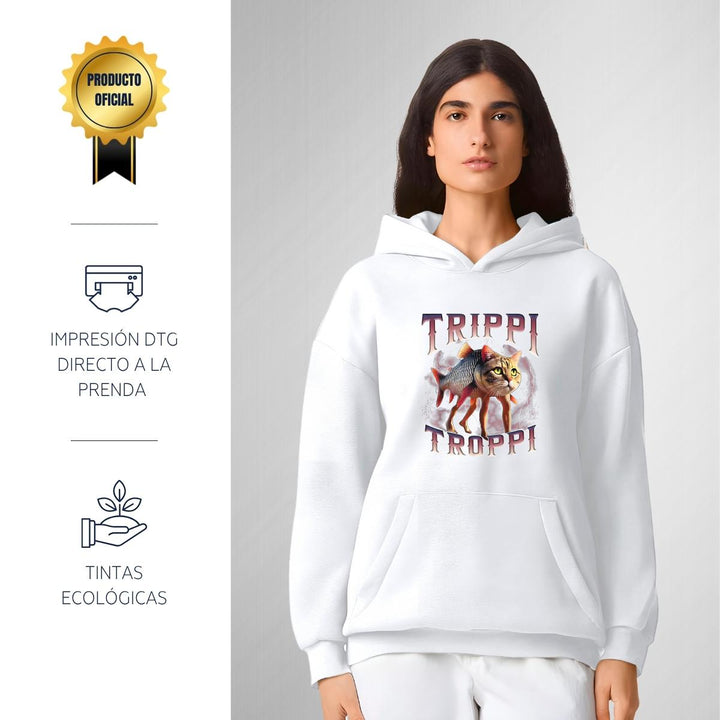 Sudadera hoodie transpirable pro dry de adulto con gorro o capucha y bolsillo frontal canguro, para mujer nueva, diseño Brainrot Trippi Troppi impreso con tecnología DTG (directo a la prenda) tacto cero, uso casual o deportiva, 100% poliéster, ajuste clásico. Colores de sudadera: Negro, Blanco.