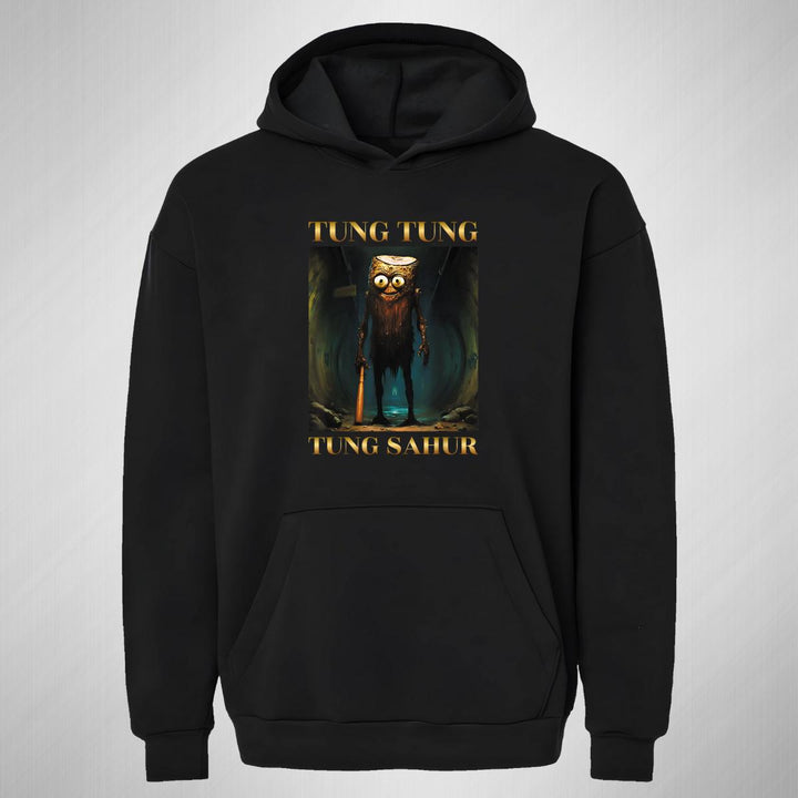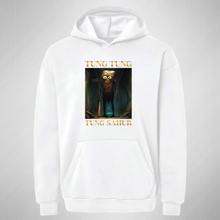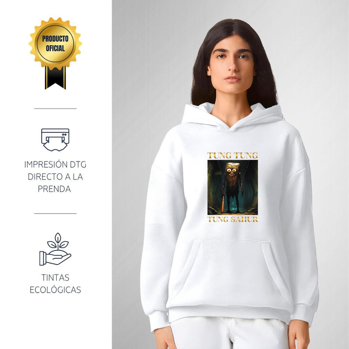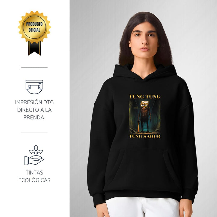 Sudadera hoodie transpirable pro dry de adulto con gorro o capucha y bolsillo frontal canguro, para mujer nueva, diseño Brainrot Tung Tung Tung Sahur impreso con tecnología DTG (directo a la prenda) tacto cero, uso casual o deportiva, 100% poliéster, ajuste clásico. Colores de sudadera: Negro, Blanco.
