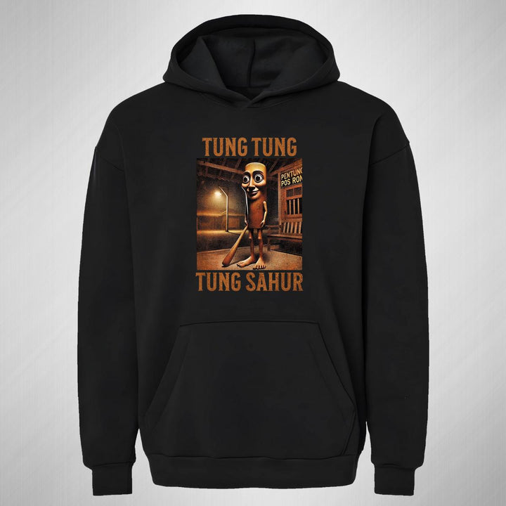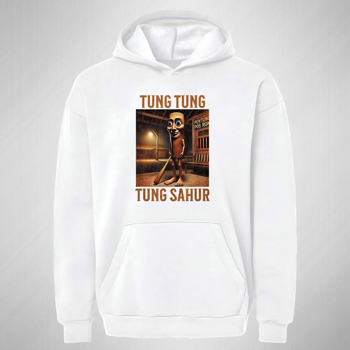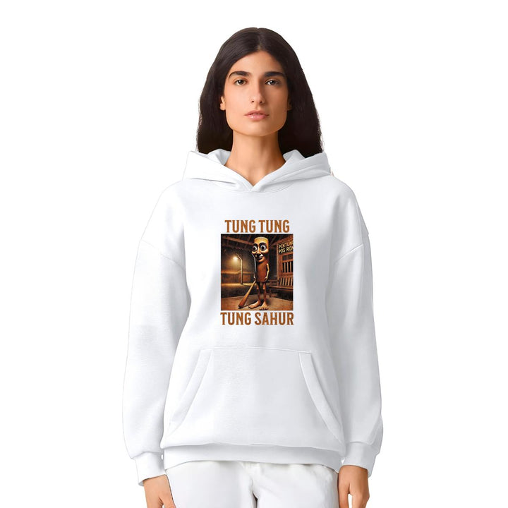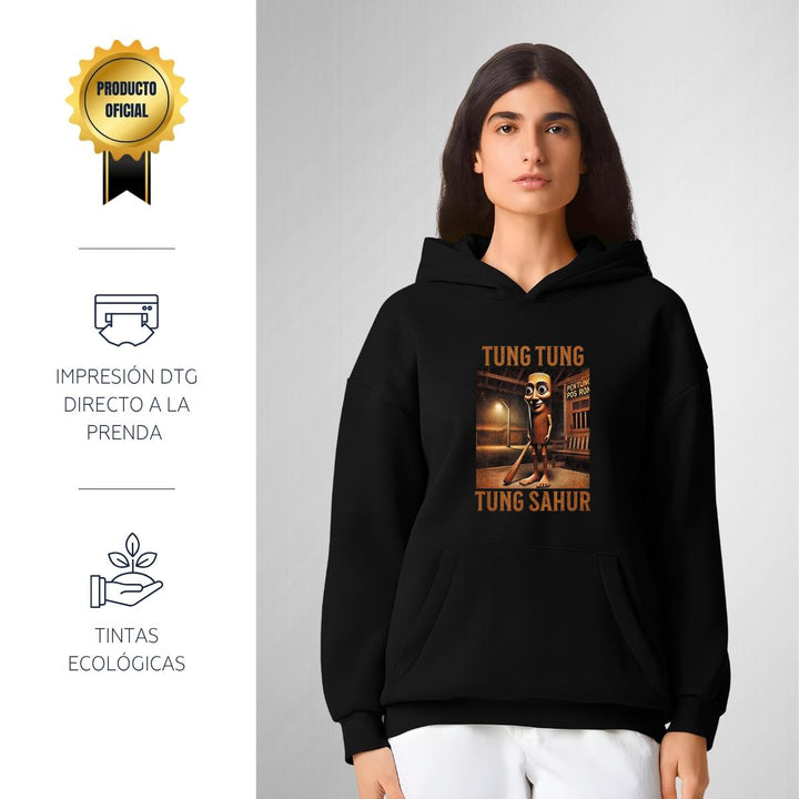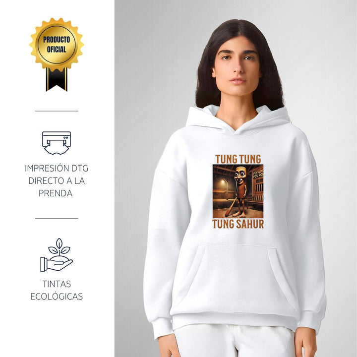 Sudadera hoodie transpirable pro dry de adulto con gorro o capucha y bolsillo frontal canguro, para mujer nueva, diseño Brainrot Tung Tung Tung Sahur impreso con tecnología DTG (directo a la prenda) tacto cero, uso casual o deportiva, 100% poliéster, ajuste clásico. Colores de sudadera: Negro, Blanco.