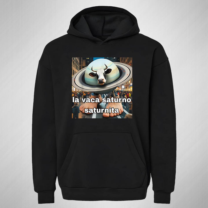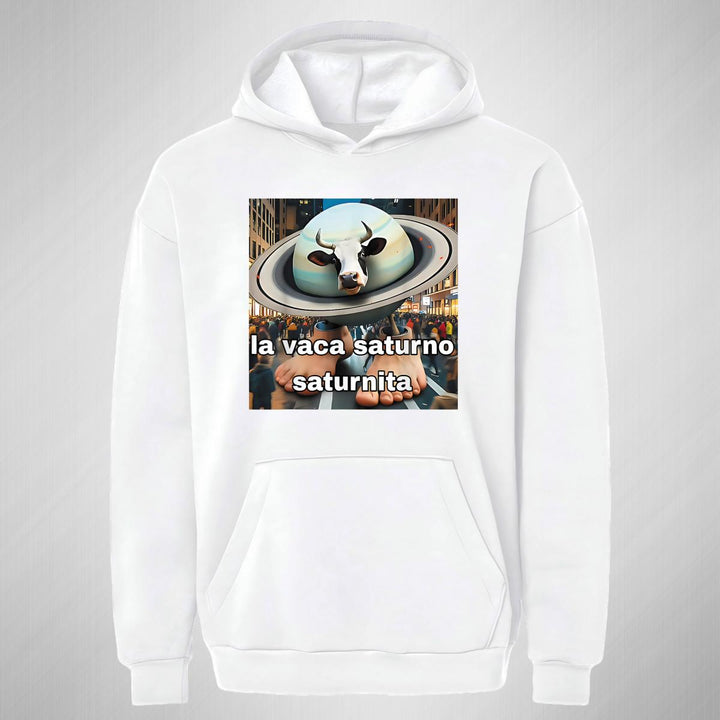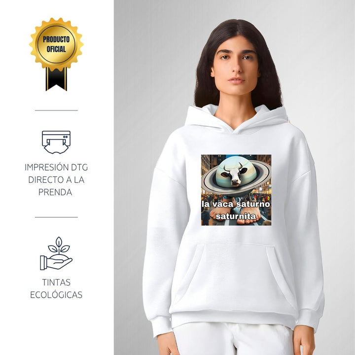 Sudadera hoodie transpirable pro dry de adulto con gorro o capucha y bolsillo frontal canguro, para mujer nueva, diseño Brainrot Vaca Saturno Saturnita impreso con tecnología DTG (directo a la prenda) tacto cero, uso casual o deportiva, 100% poliéster, ajuste clásico. Colores de sudadera: Negro, Blanco.