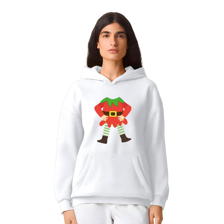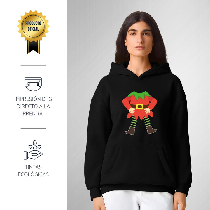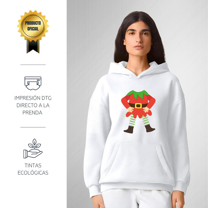Sudadera hoodie transpirable pro dry de adulto con gorro o capucha y bolsillo frontal canguro, para mujer nueva, diseño Duende impreso con tecnología DTG (directo a la prenda) tacto cero, uso casual o deportiva, 100% poliéster, ajuste clásico. Colores de sudadera: Negro, Blanco.