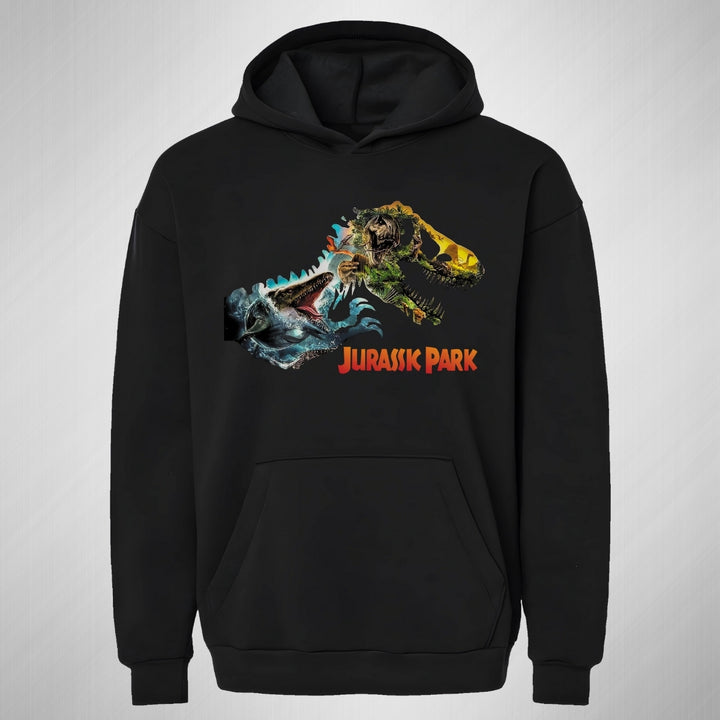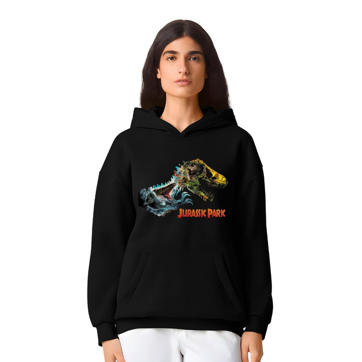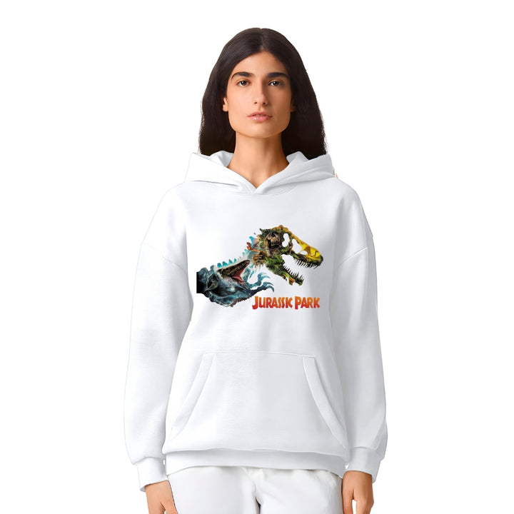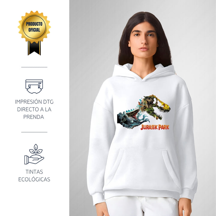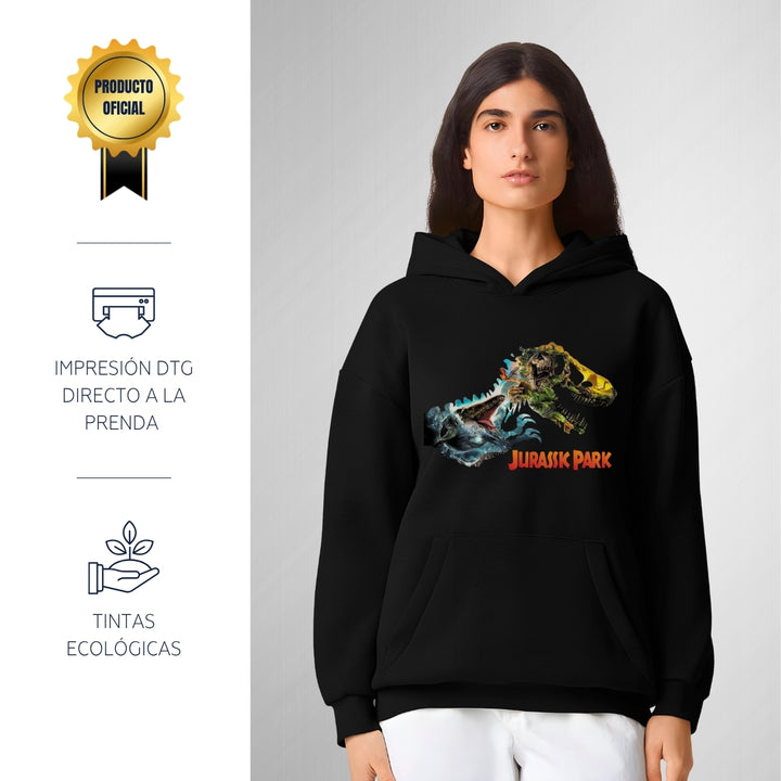 Sudadera hoodie transpirable pro dry de adulto con gorro o capucha y bolsillo frontal canguro, para mujer nueva, diseño Jurassic Park impreso con tecnología DTG (directo a la prenda) tacto cero, uso casual o deportiva, 100% poliéster, ajuste clásico. Colores de sudadera: Negro, Blanco.