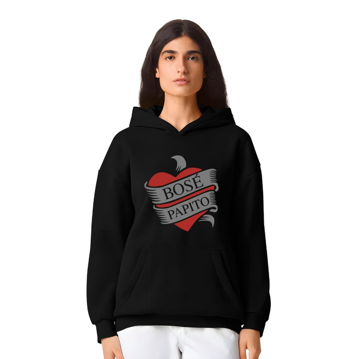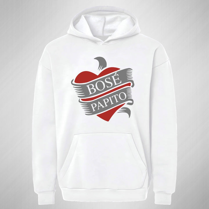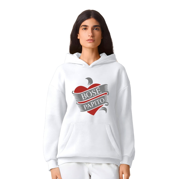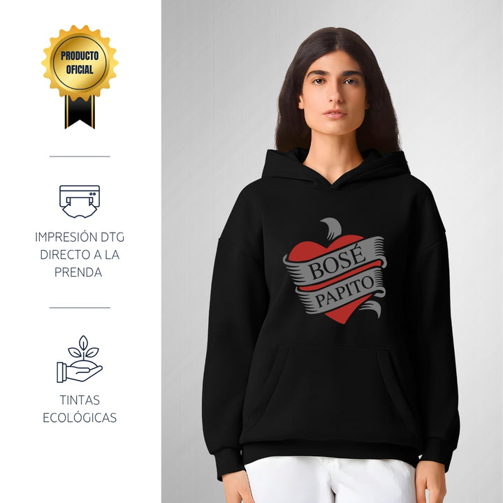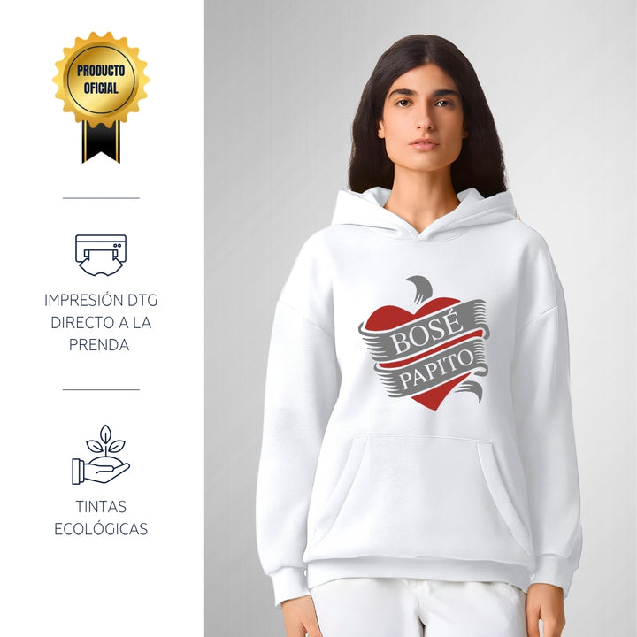 Sudadera hoodie transpirable pro dry de adulto con gorro o capucha y bolsillo frontal canguro, para mujer nueva, diseño Miguel Bosé Papito impreso con tecnología DTG (directo a la prenda) tacto cero, uso casual o deportiva, 100% poliéster, ajuste clásico. Colores de sudadera: Negro, Blanco.
