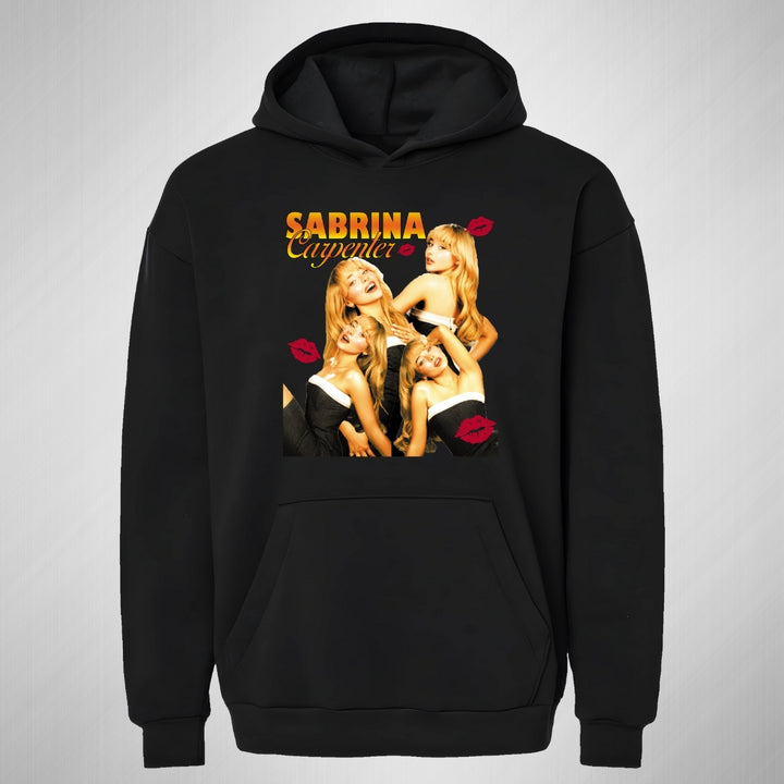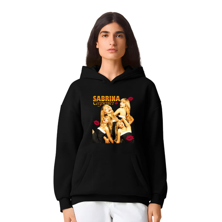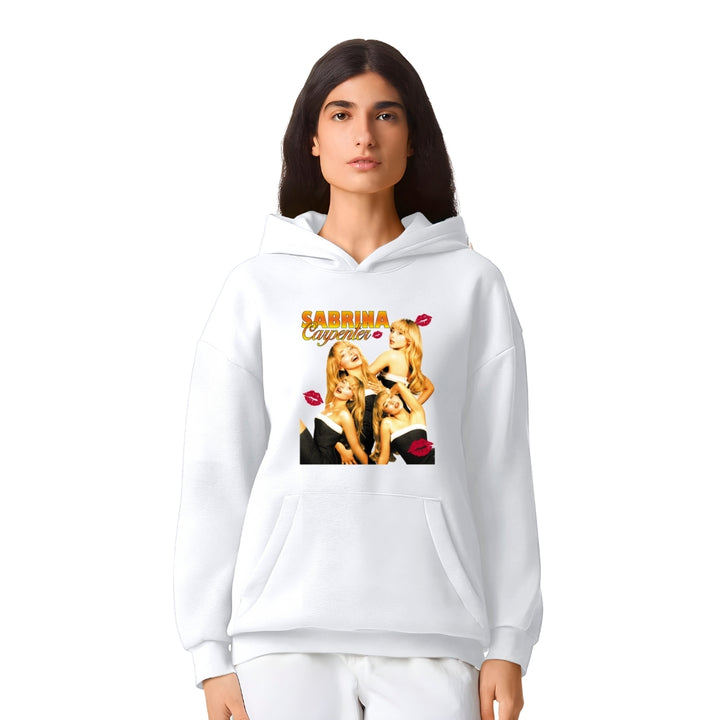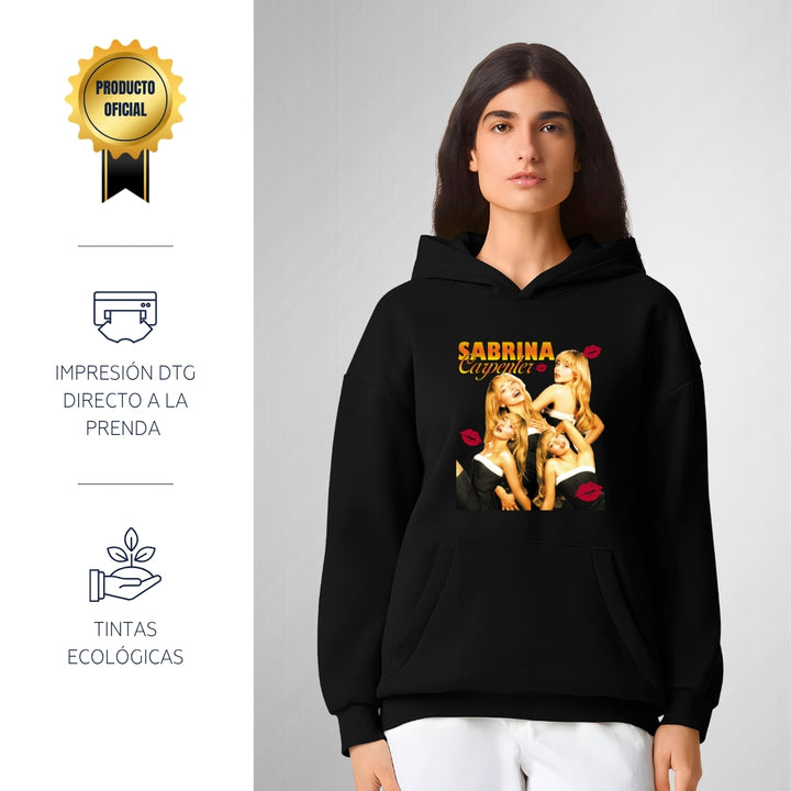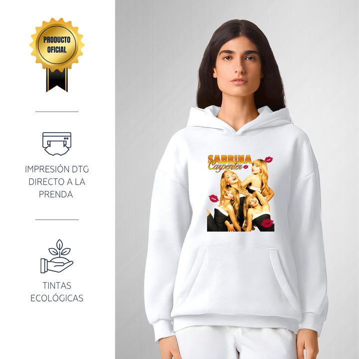 Sudadera hoodie transpirable pro dry de adulto con gorro o capucha y bolsillo frontal canguro, para mujer nueva, diseño Sabrina CaSHenter impreso con tecnología DTG (directo a la prenda) tacto cero, uso casual o deportiva, 100% poliéster, ajuste clásico. Colores de sudadera: Negro, Blanco.