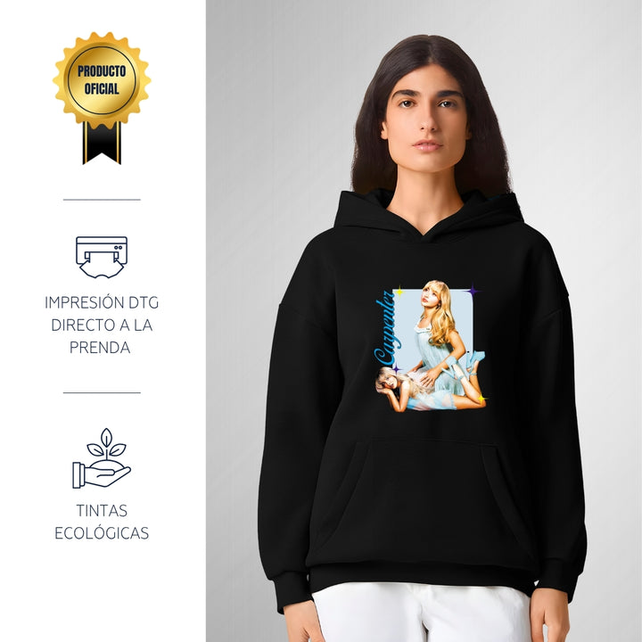 Sudadera hoodie transpirable pro dry de adulto con gorro o capucha y bolsillo frontal canguro, para mujer nueva, diseño Sabrina CaSHenter Tour impreso con tecnología DTG (directo a la prenda) tacto cero, uso casual o deportiva, 100% poliéster, ajuste clásico. Colores de sudadera: Negro, Blanco.