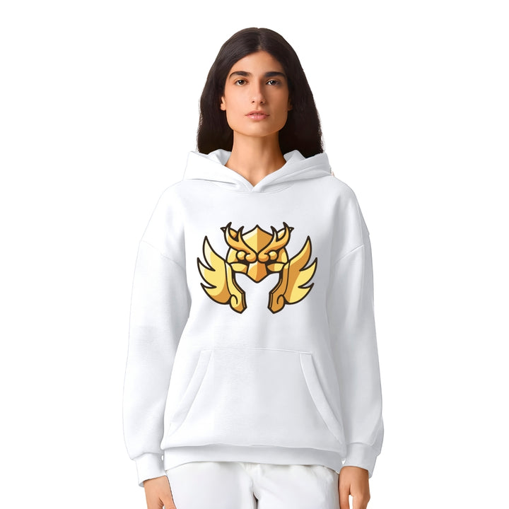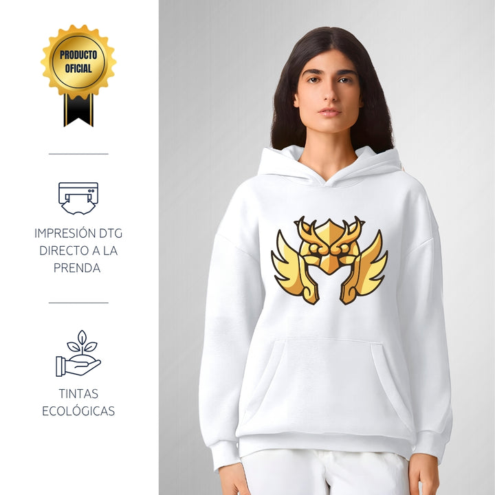 Sudadera hoodie transpirable pro dry de adulto con gorro o capucha y bolsillo frontal canguro, para mujer nueva, diseño Saint Seiya Libra impreso con tecnología DTG (directo a la prenda) tacto cero, uso casual o deportiva, 100% poliéster, ajuste clásico. Colores de sudadera: Negro, Blanco.