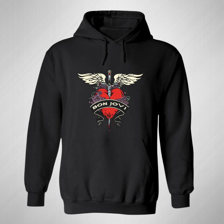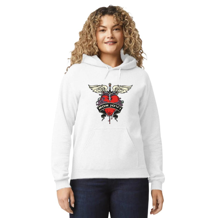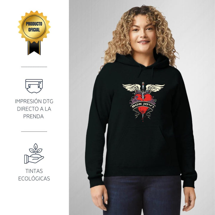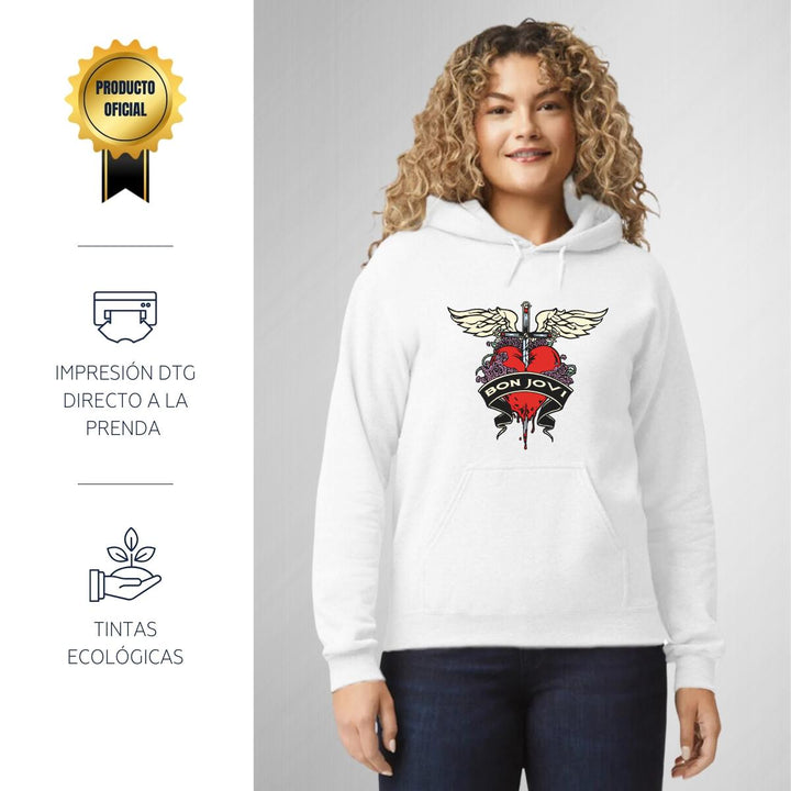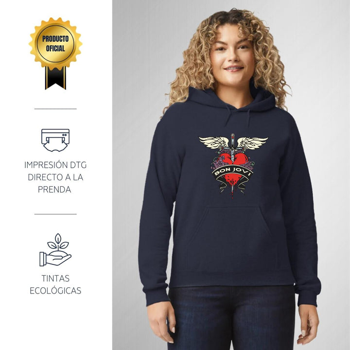 Sudadera hoodie de adulto con gorro o capucha y bolsillo frontal canguro, para mujer nueva, diseño Rock Bon Jovi Logo original impreso con tecnología DTG (directo a la prenda) tacto cero, uso casual o deportiva, 50% algodón y 50% poliéster fleece pre encogido, estructura tubular con ajuste clásico. Colores de sudadera: Negro, Blanco, Azul Marino, Gris.