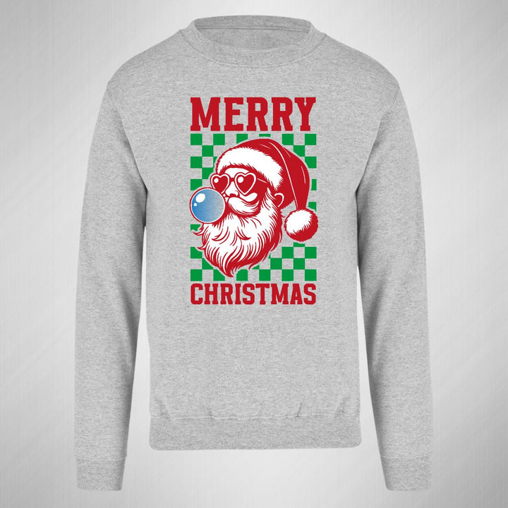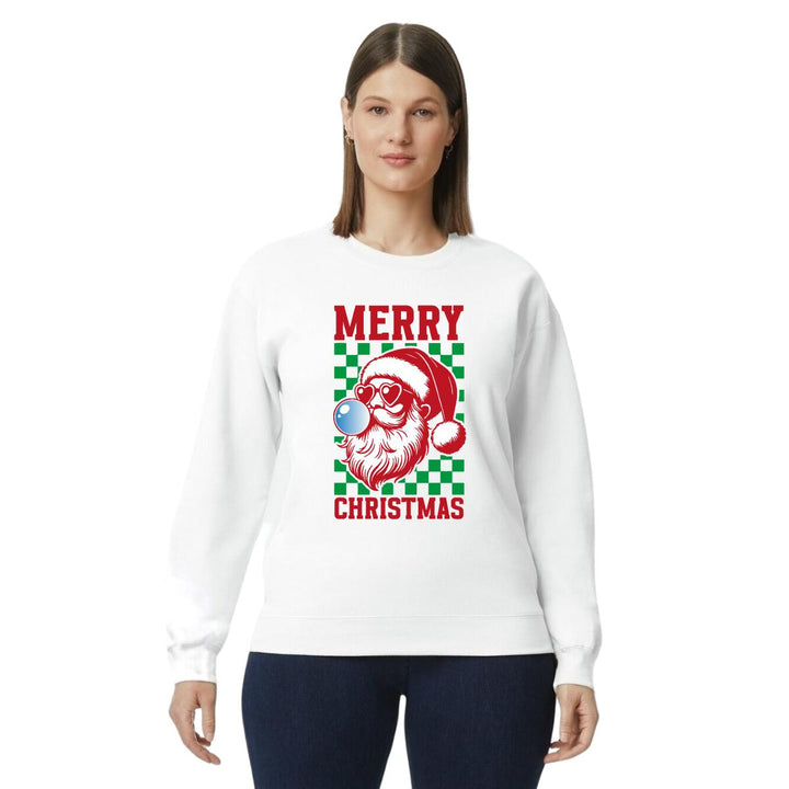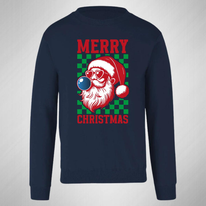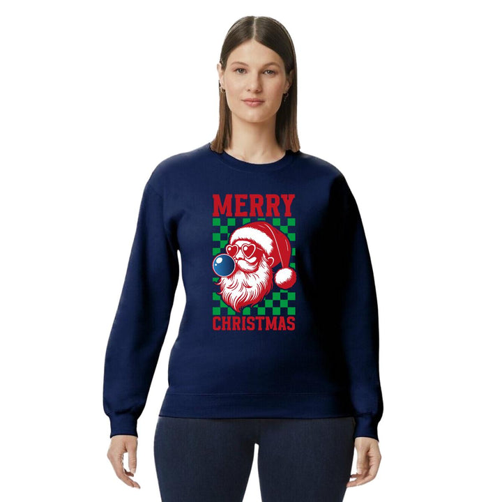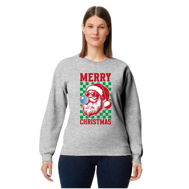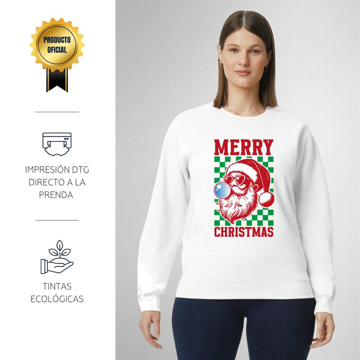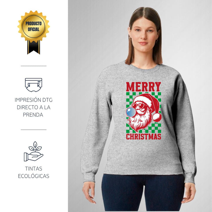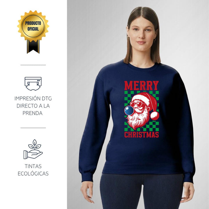Sudadera de adulto cuello redondo sin gorro o capucha, para mujer nueva, diseño Merry Christmas original impreso con tecnología DTG (directo a la prenda) tacto cero, uso casual o deportiva, 50% algodón y 50% poliéster, estructura sin costura en los costados con ajuste clásico. Colores de sudadera: Negro, Blanco, Azul Marino, Gris.