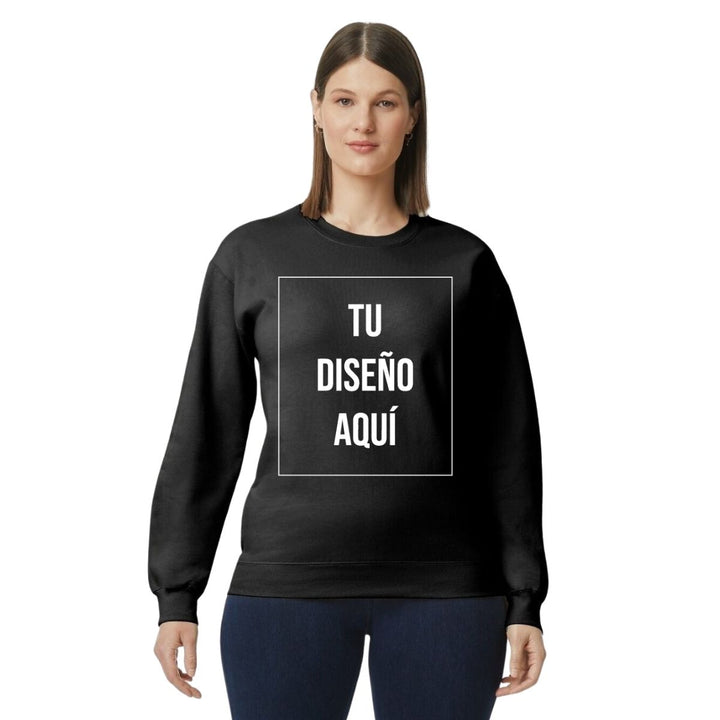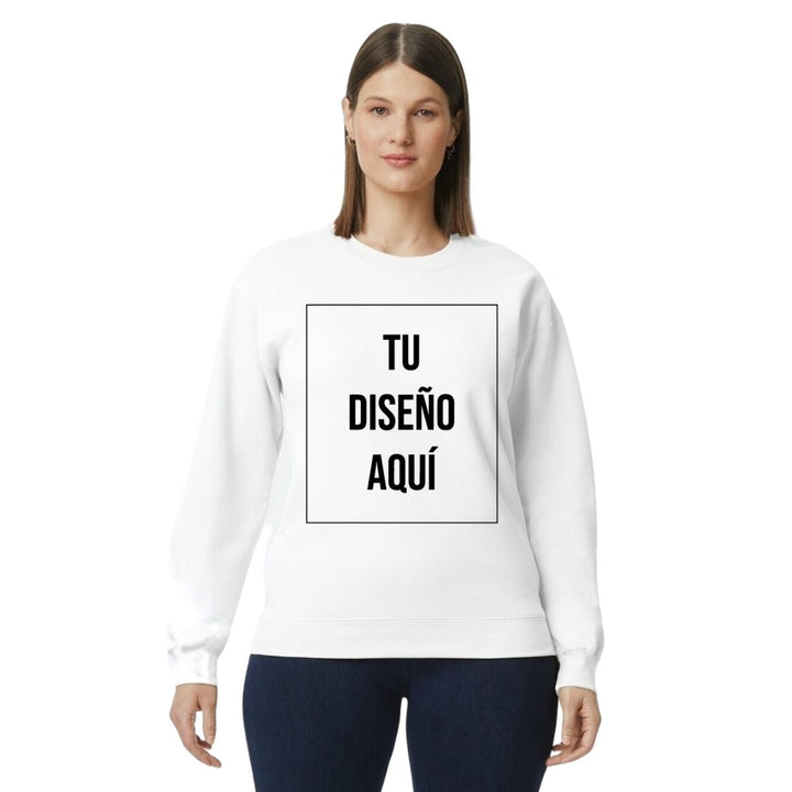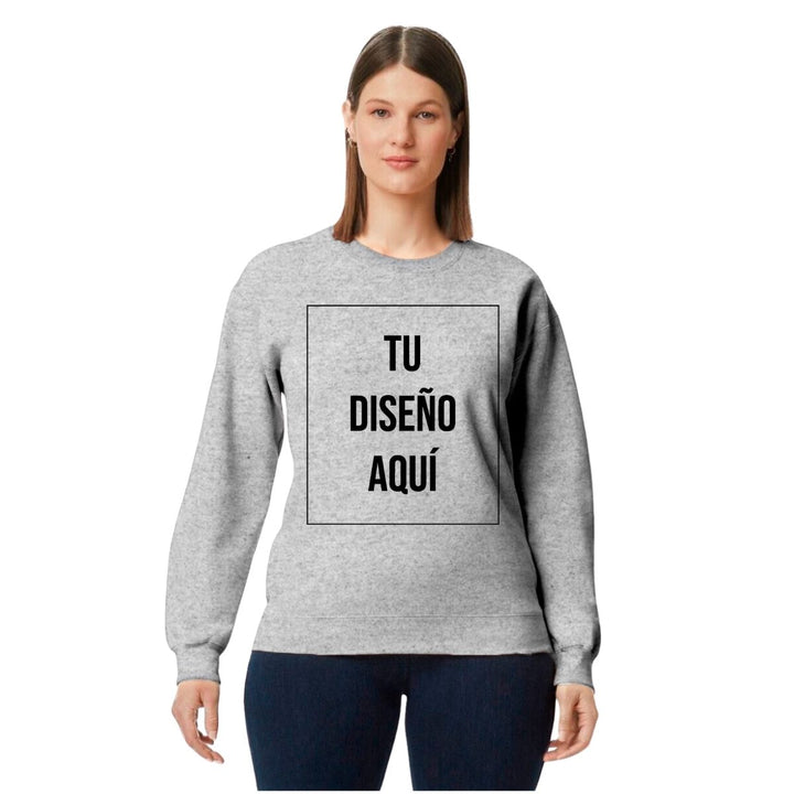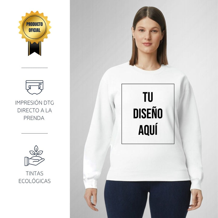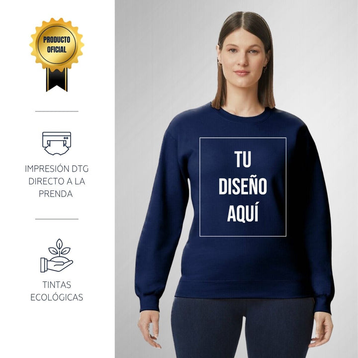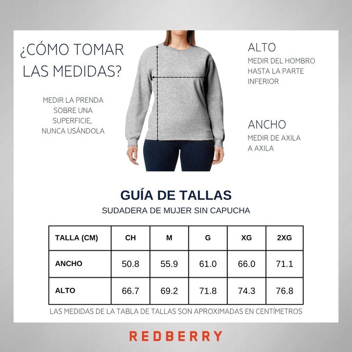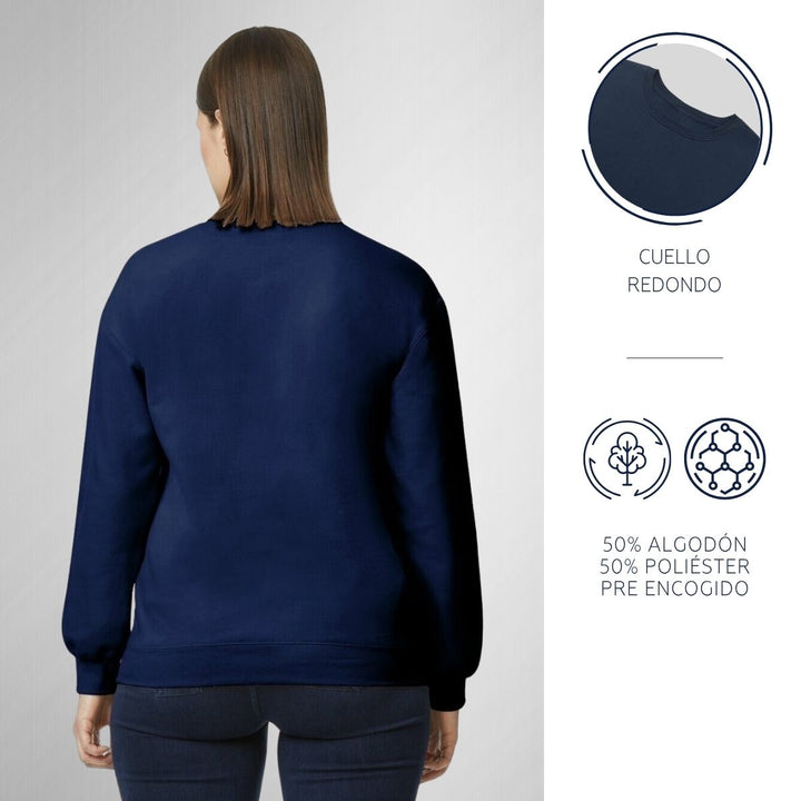 Sudadera de adulto cuello redondo sin gorro o capucha, para mujer nueva, diseño personalizado impreso con tecnología DTG (directo a la prenda) tacto cero, uso casual o deportiva, 50% algodón y 50% poliéster, estructura sin costura en los costados con ajuste clásico. Colores de sudadera: Negro, Blanco, Azul Marino, Gris.