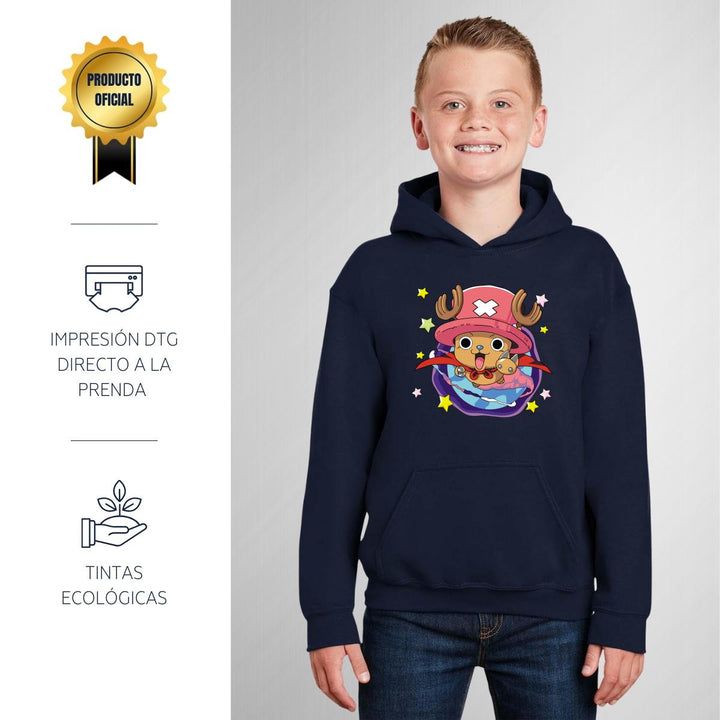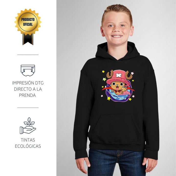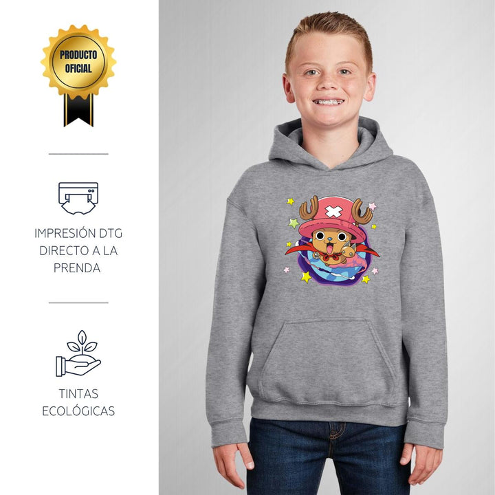 Sudadera hoodie infantil con gorro o capucha y bolsillo frontal canguro nueva, para niño o niña, diseño Anime One Piece Tony Tony Chopper original impreso con tecnología DTG (directo a la prenda) tacto cero, uso casual o deportiva, 50% algodón y 50% poliéster fleece pre encogido, estructura tubular con ajuste clásico. Colores de sudadera: Negro, Blanco, Azul Marino, Gris.