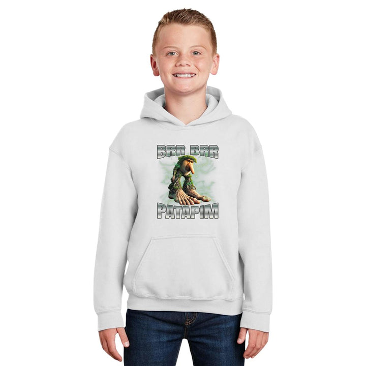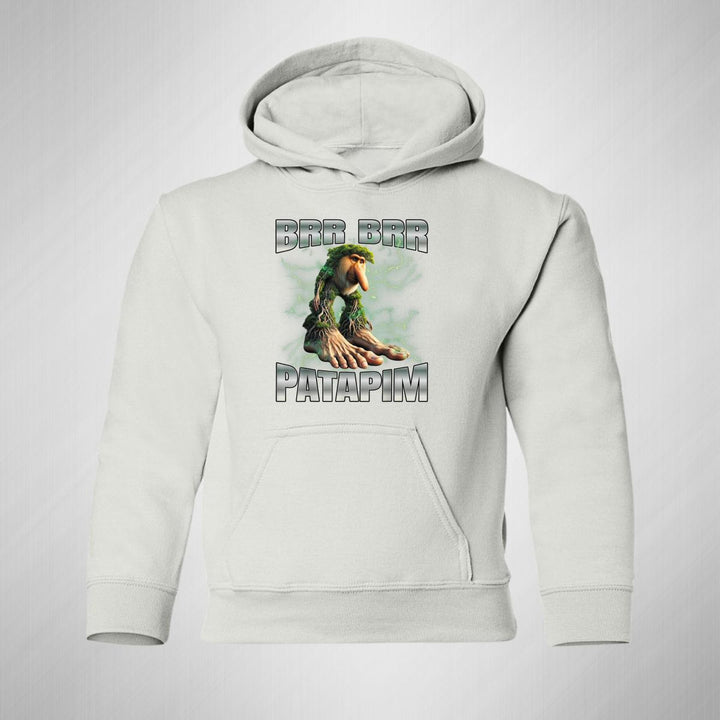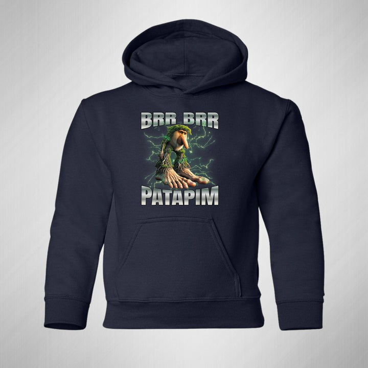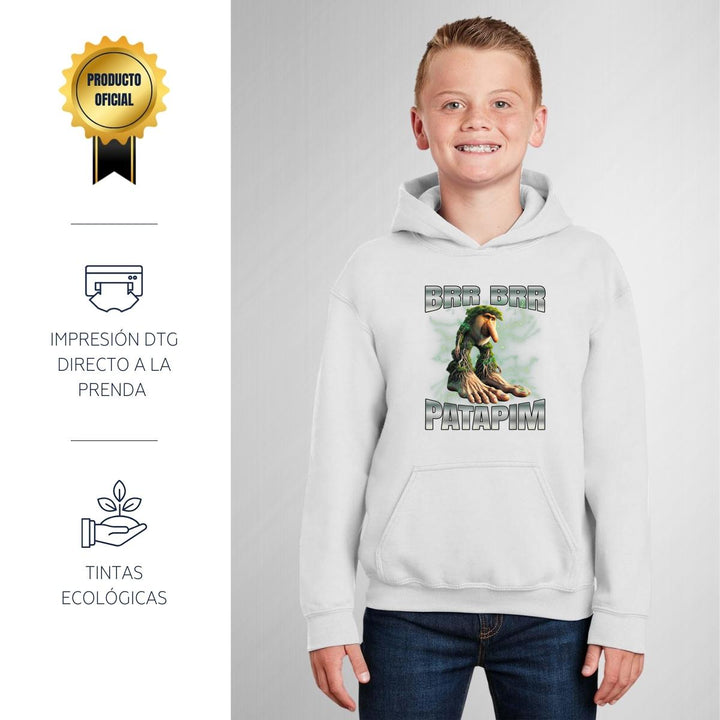 Sudadera hoodie infantil con gorro o capucha y bolsillo frontal canguro nueva, para niño o niña, diseño Brainrot Brr Brr Patapim original impreso con tecnología DTG (directo a la prenda) tacto cero, uso casual o deportiva, 50% algodón y 50% poliéster fleece pre encogido, estructura tubular con ajuste clásico. Colores de sudadera: Negro, Blanco, Azul Marino, Gris.