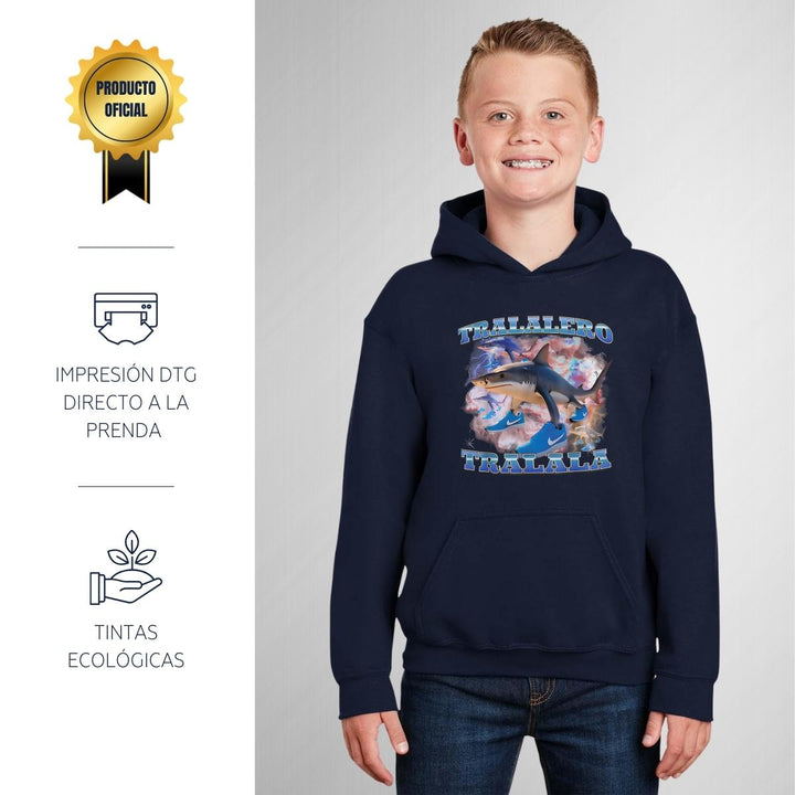 Sudadera hoodie infantil con gorro o capucha y bolsillo frontal canguro nueva, para niño o niña, diseño Brainrot Tralalero Tralala original impreso con tecnología DTG (directo a la prenda) tacto cero, uso casual o deportiva, 50% algodón y 50% poliéster fleece pre encogido, estructura tubular con ajuste clásico. Colores de sudadera: Negro, Blanco, Azul Marino, Gris.
