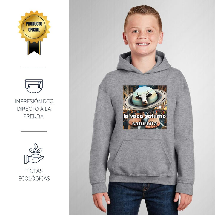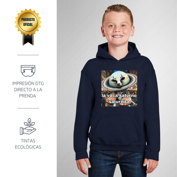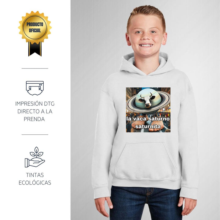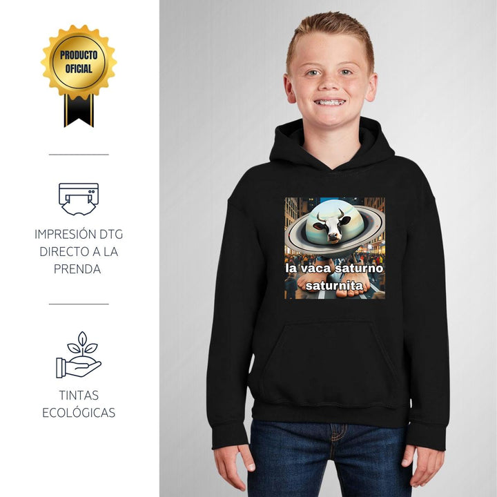 Sudadera hoodie infantil con gorro o capucha y bolsillo frontal canguro nueva, para niño o niña, diseño Brainrot Vaca Saturno Saturnita original impreso con tecnología DTG (directo a la prenda) tacto cero, uso casual o deportiva, 50% algodón y 50% poliéster fleece pre encogido, estructura tubular con ajuste clásico. Colores de sudadera: Negro, Blanco, Azul Marino, Gris.