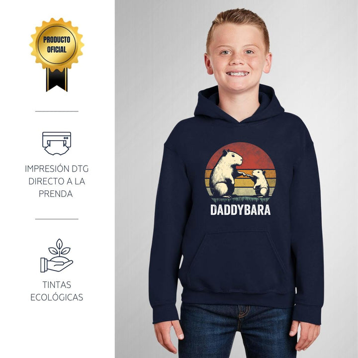 Sudadera hoodie infantil con gorro o capucha y bolsillo frontal canguro nueva, para niño o niña, diseño Capibara Carpincho Frases original impreso con tecnología DTG (directo a la prenda) tacto cero, uso casual o deportiva, 50% algodón y 50% poliéster fleece pre encogido, estructura tubular con ajuste clásico. Colores de sudadera: Negro, Azul Marino.