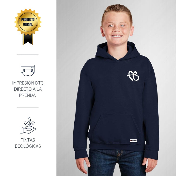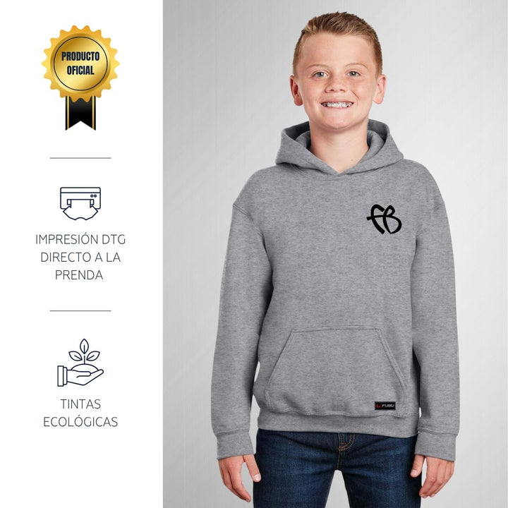 Sudadera hoodie infantil con gorro o capucha y bolsillo frontal canguro nueva, para niño o niña, diseño Logo Monocromático original impreso con tecnología DTG (directo a la prenda) tacto cero, uso casual o deportiva, 50% algodón y 50% poliéster fleece pre encogido, estructura tubular con ajuste clásico. Colores de sudadera: Negro, Blanco, Azul Marino, Gris.