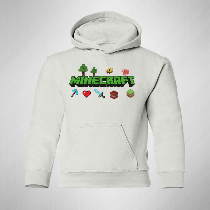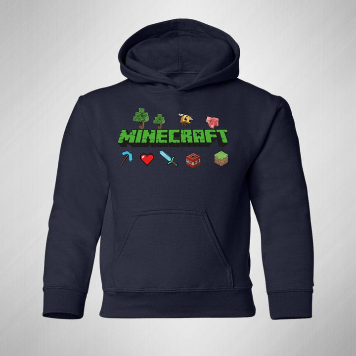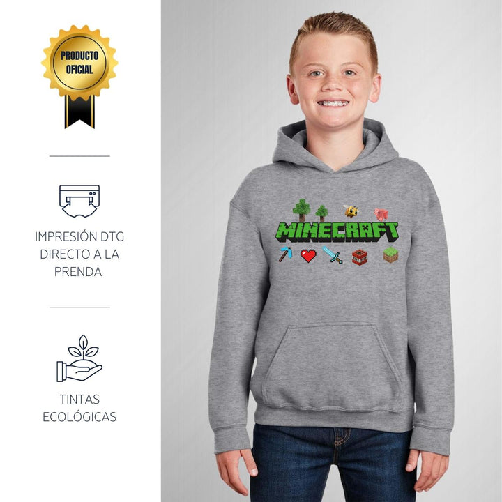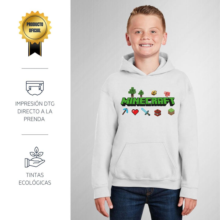 Sudadera hoodie infantil con gorro o capucha y bolsillo frontal canguro nueva, para niño o niña, diseño Gamer Minecraft original impreso con tecnología DTG (directo a la prenda) tacto cero, uso casual o deportiva, 50% algodón y 50% poliéster fleece pre encogido, estructura tubular con ajuste clásico. Colores de sudadera: Negro, Blanco, Azul Marino, Gris.