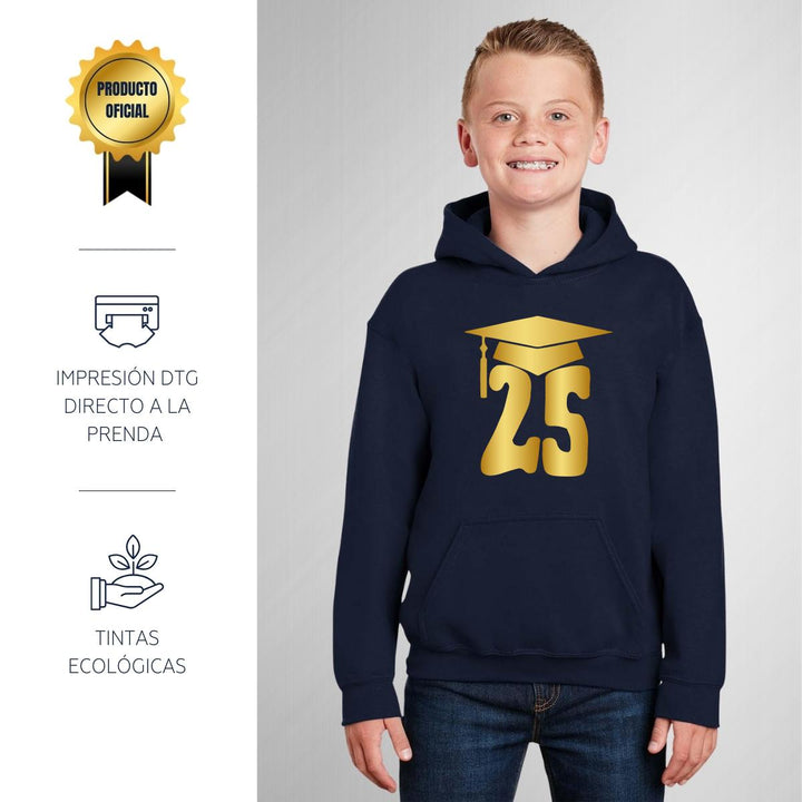 Sudadera hoodie infantil con gorro o capucha y bolsillo frontal canguro nueva, para niño o niña, diseño Graduación Graduado Birrete original impreso con tecnología DTG (directo a la prenda) tacto cero, uso casual o deportiva, 50% algodón y 50% poliéster fleece pre encogido, estructura tubular con ajuste clásico. Colores de sudadera: Negro, Blanco, Azul Marino, Gris.