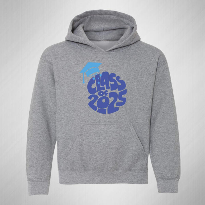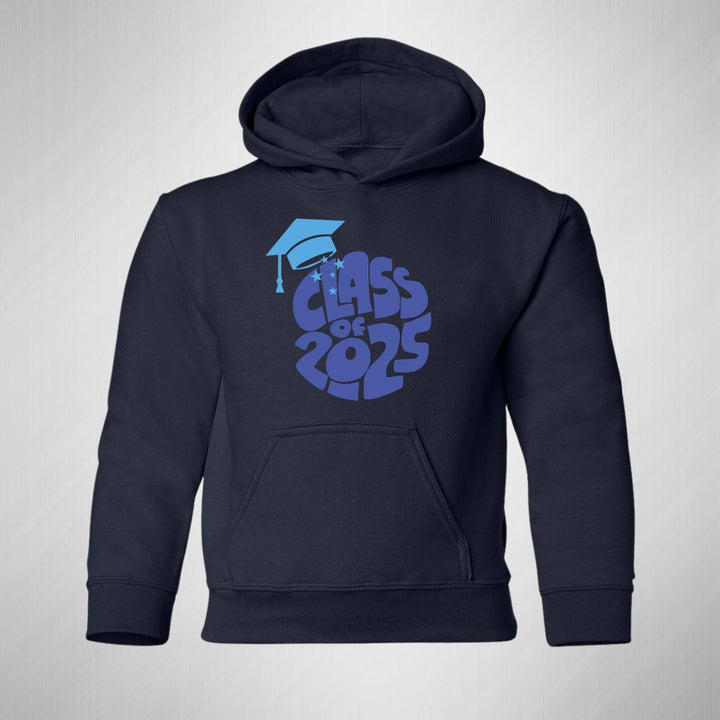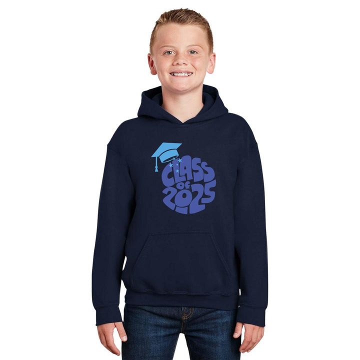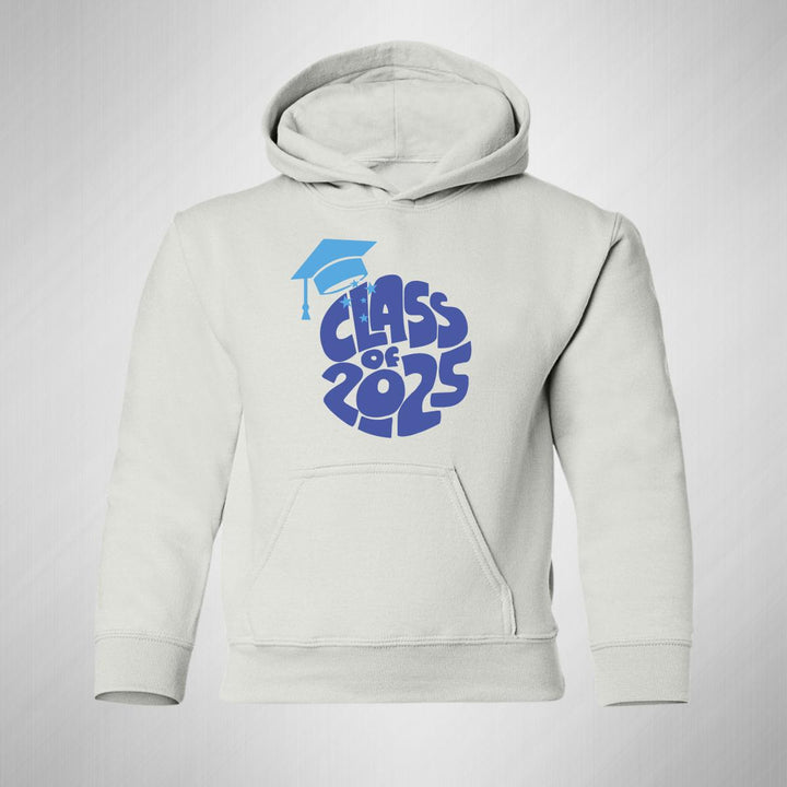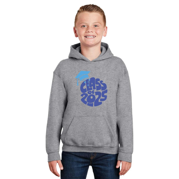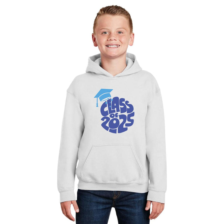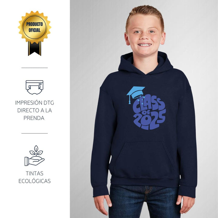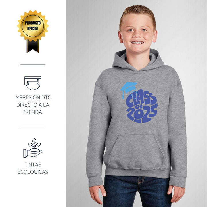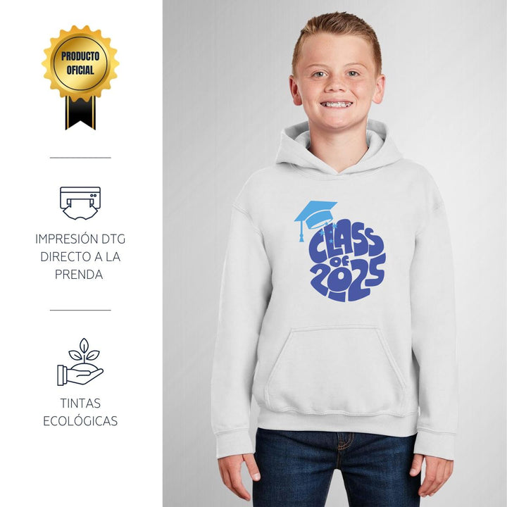 Sudadera hoodie infantil con gorro o capucha y bolsillo frontal canguro nueva, para niño o niña, diseño Graduación Graduado Birrete Class Of - AZ original impreso con tecnología DTG (directo a la prenda) tacto cero, uso casual o deportiva, 50% algodón y 50% poliéster fleece pre encogido, estructura tubular con ajuste clásico. Colores de sudadera: Negro, Blanco, Azul Marino, Gris.