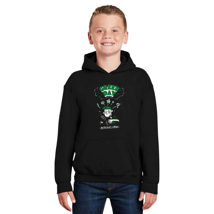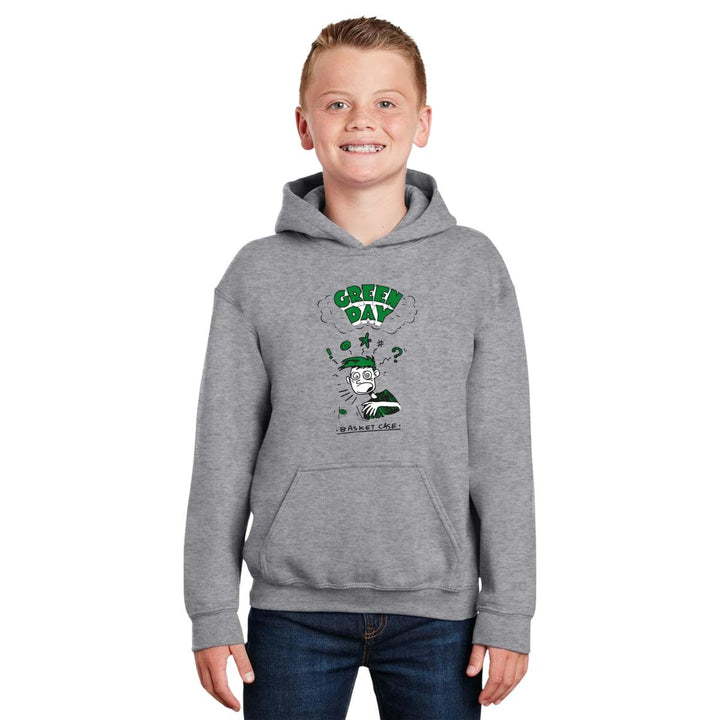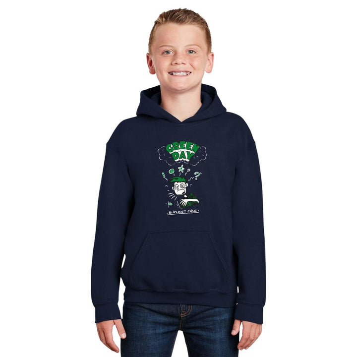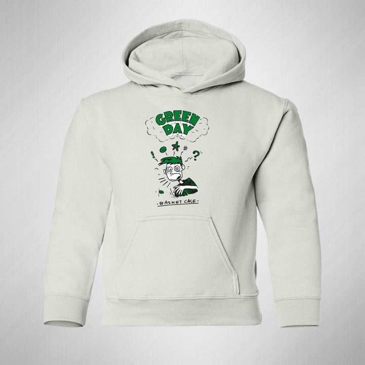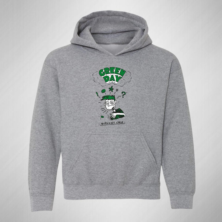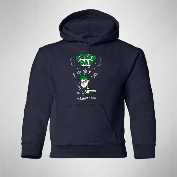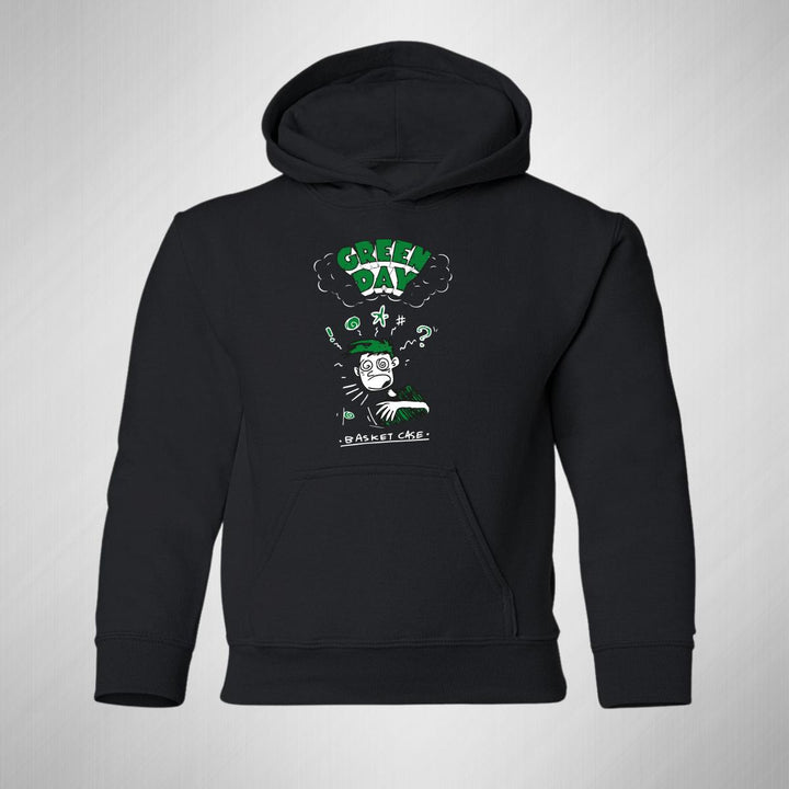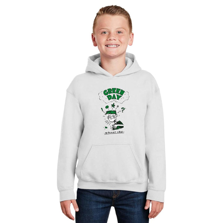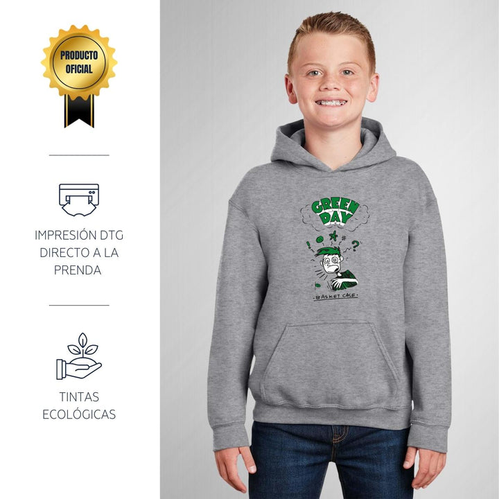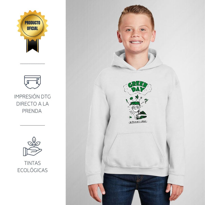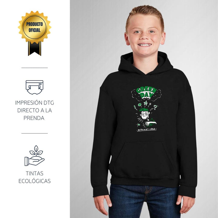 Sudadera hoodie infantil con gorro o capucha y bolsillo frontal canguro nueva, para niño o niña, diseño Green Day Basket Case original impreso con tecnología DTG (directo a la prenda) tacto cero, uso casual o deportiva, 50% algodón y 50% poliéster fleece pre encogido, estructura tubular con ajuste clásico. Colores de sudadera: Negro, Blanco, Azul Marino, Gris.