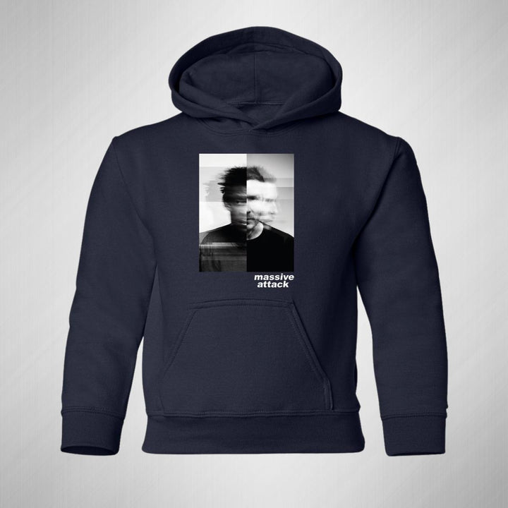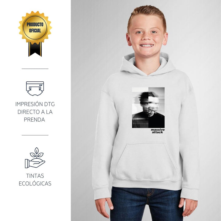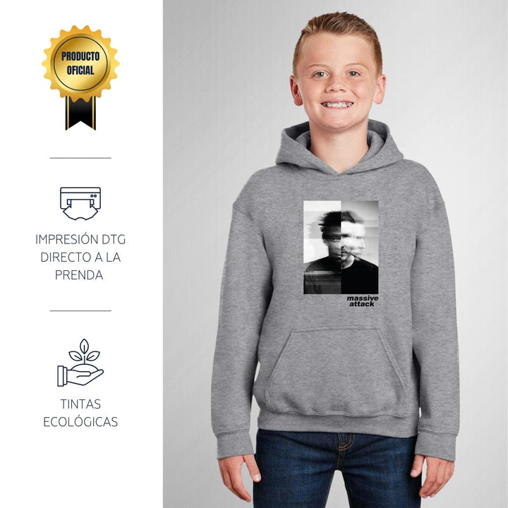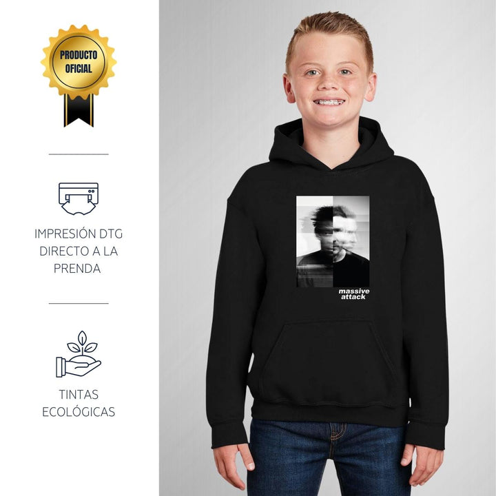 Sudadera hoodie infantil con gorro o capucha y bolsillo frontal canguro nueva, para niño o niña, diseño Massive Attack Rock Concierto original impreso con tecnología DTG (directo a la prenda) tacto cero, uso casual o deportiva, 50% algodón y 50% poliéster fleece pre encogido, estructura tubular con ajuste clásico. Colores de sudadera: Negro, Blanco, Azul Marino, Gris.