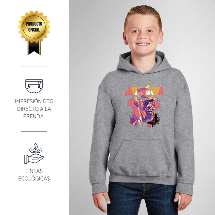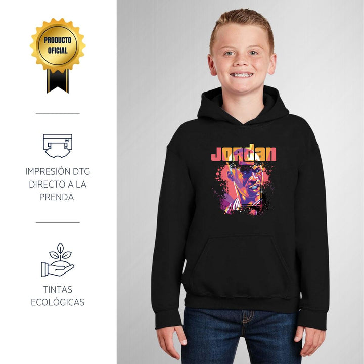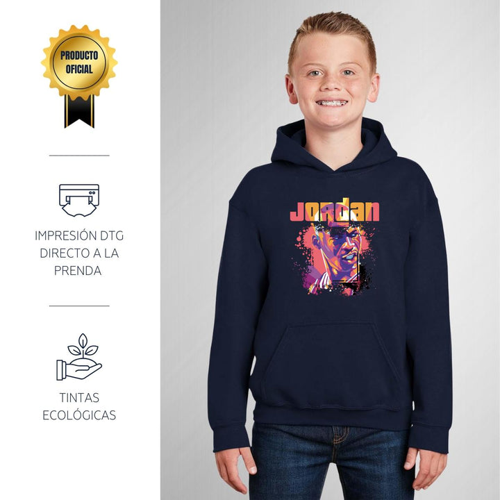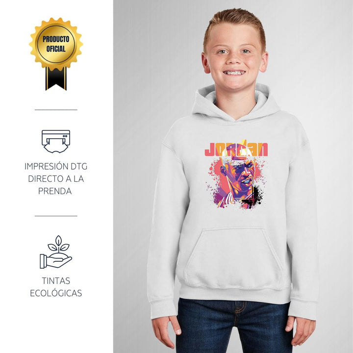 Sudadera hoodie infantil con gorro o capucha y bolsillo frontal canguro nueva, para niño o niña, diseño Michael Jordan Basquetbolista original impreso con tecnología DTG (directo a la prenda) tacto cero, uso casual o deportiva, 50% algodón y 50% poliéster fleece pre encogido, estructura tubular con ajuste clásico. Colores de sudadera: Negro, Blanco, Azul Marino, Gris.