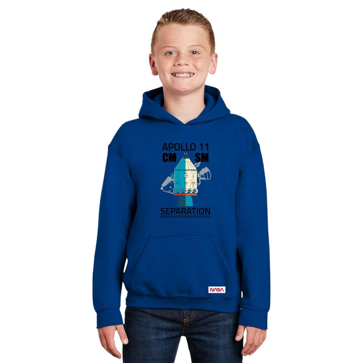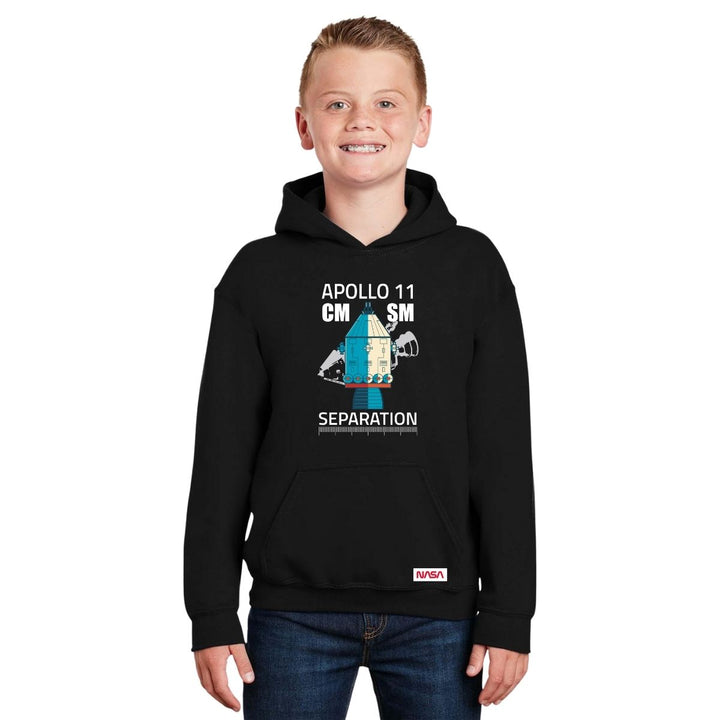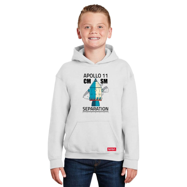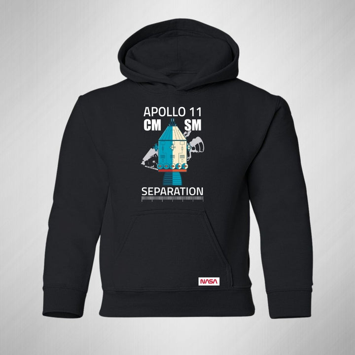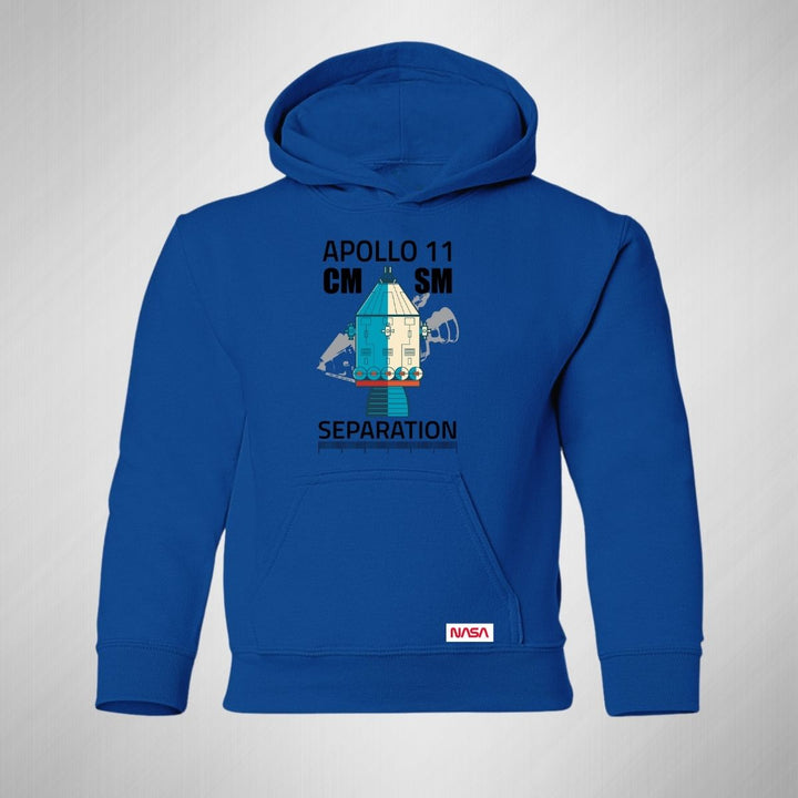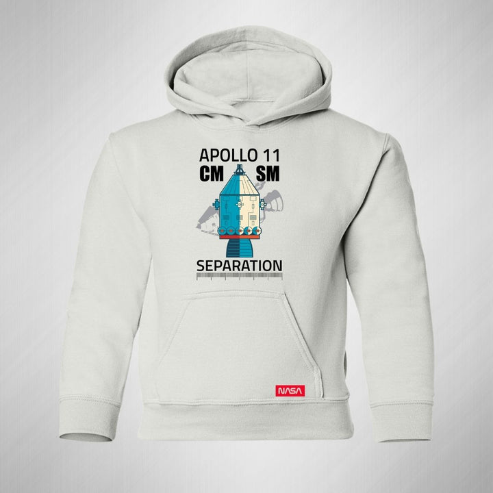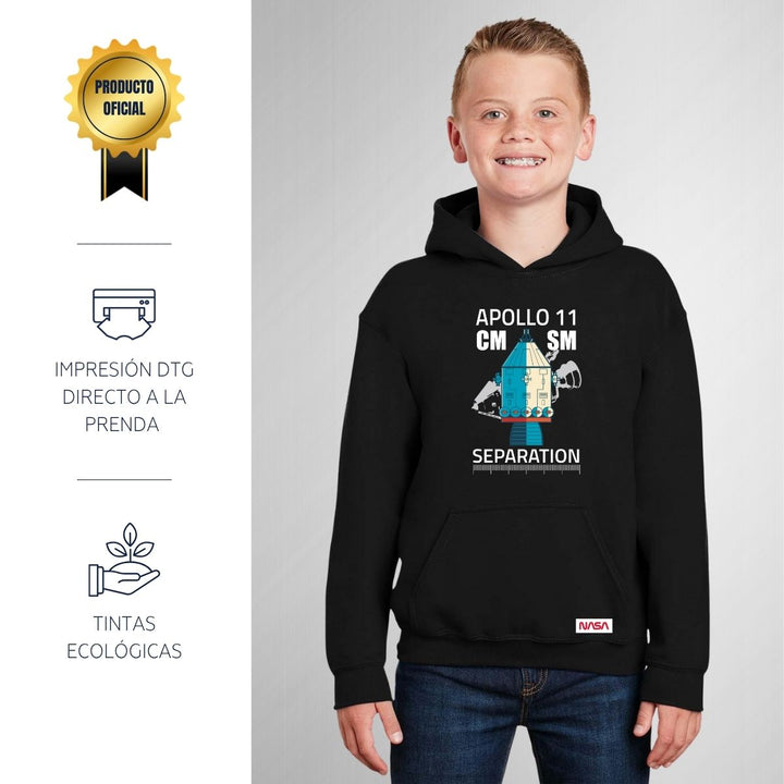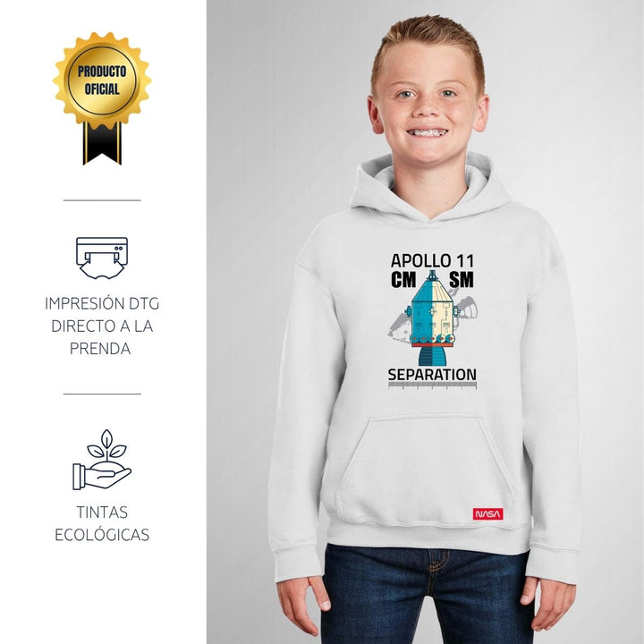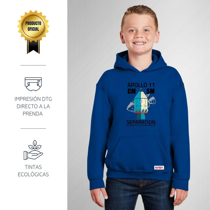 Sudadera hoodie infantil con gorro o capucha y bolsillo frontal canguro nueva, para niño o niña, diseño Apollo 11 original impreso con tecnología DTG (directo a la prenda) tacto cero, uso casual o deportiva, 50% algodón y 50% poliéster fleece pre encogido, estructura tubular con ajuste clásico. Colores de sudadera: Azul Rey, Blanco, Negro.